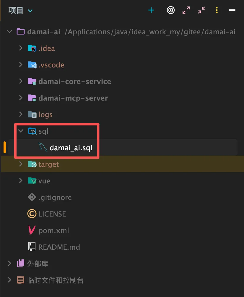 执行sql文件件下的damai_ai.sql文件