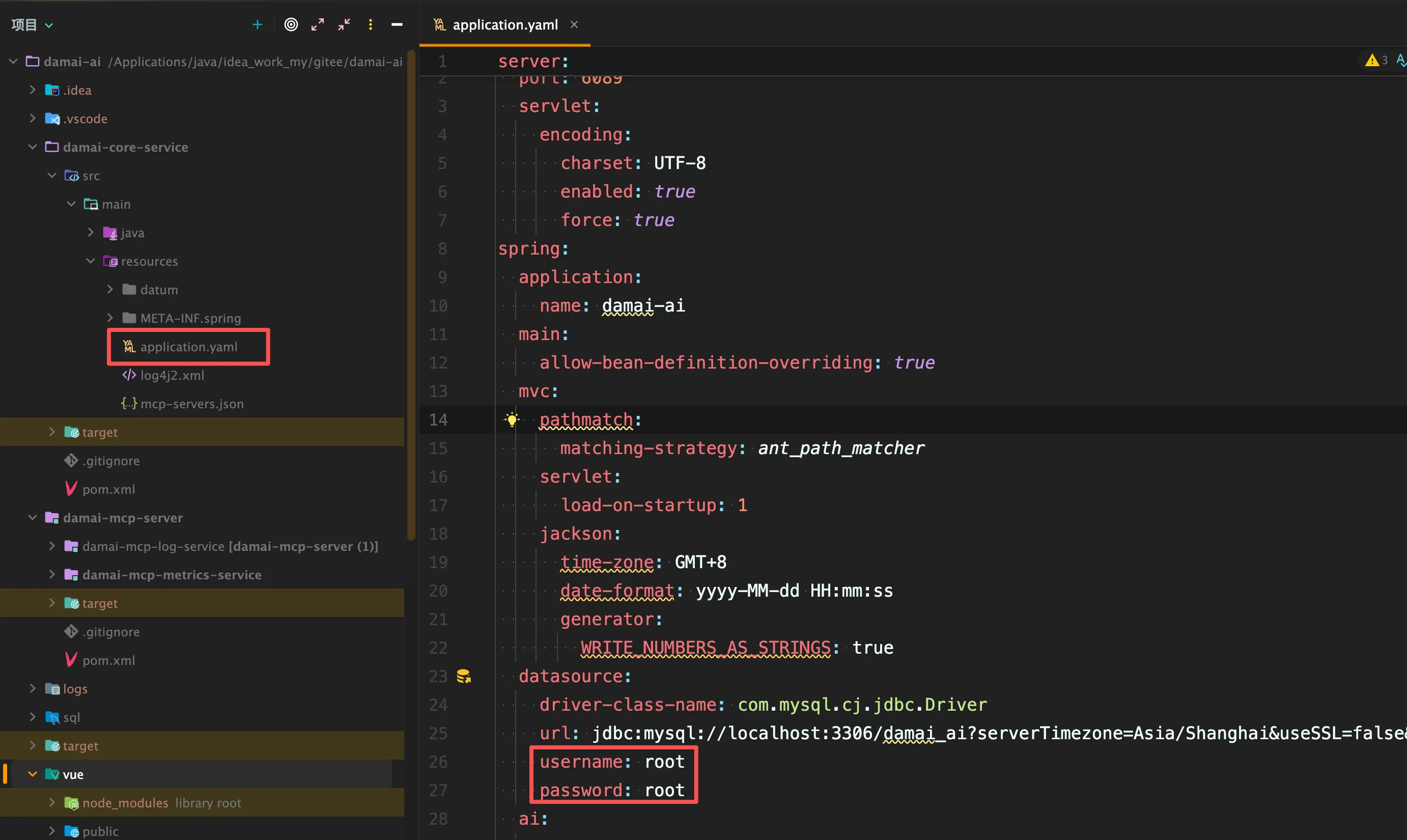 如果想修改项目中连接数据库的账户和密码,需要在以下配置文件中进行修改