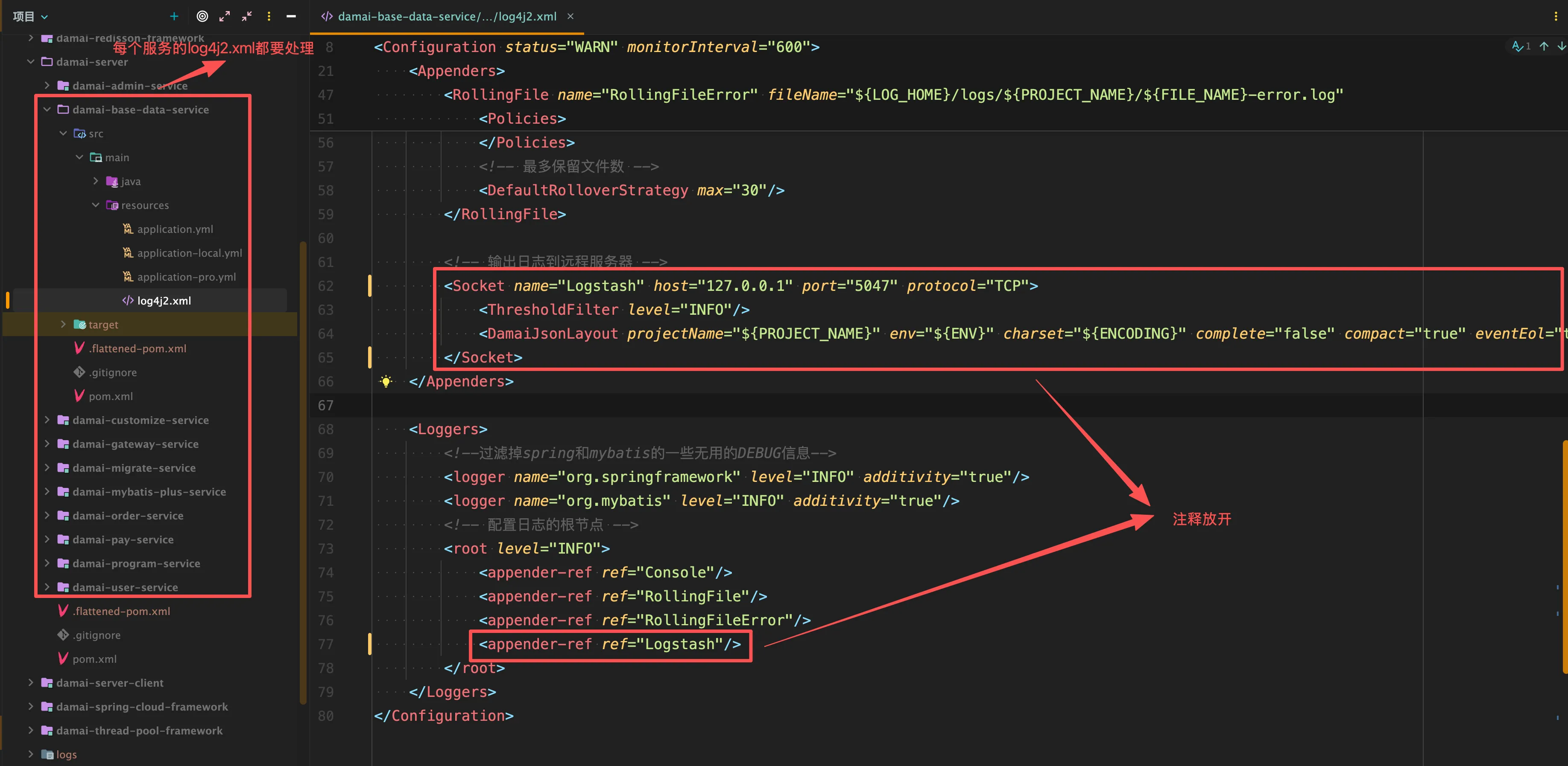 此日志数据需要从大麦项目上报,所以需要启动大麦项目,并每个服务中的log4j2.xml中的上报功能开启(默认给注释了)