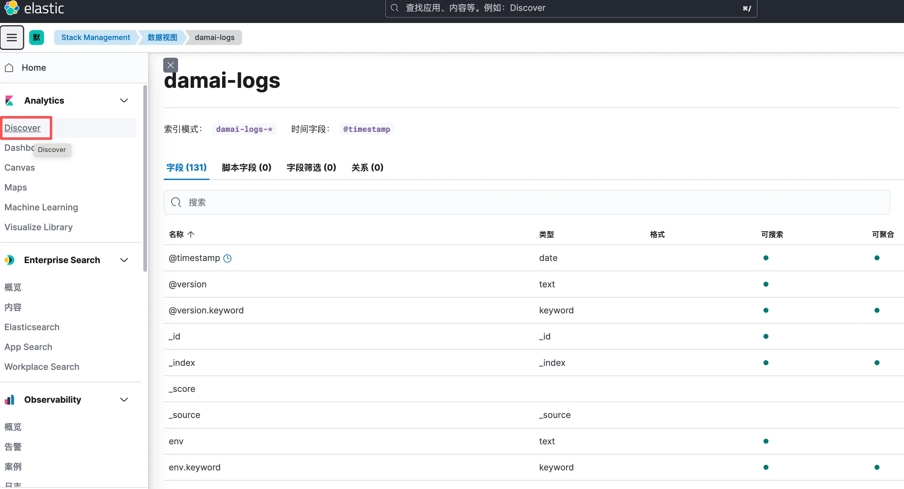 搭建好ELK后,启动大麦项目的服务,就可以将日志上报给ELK了,接着进入Kibana中,来创建日志视图进行查看日志