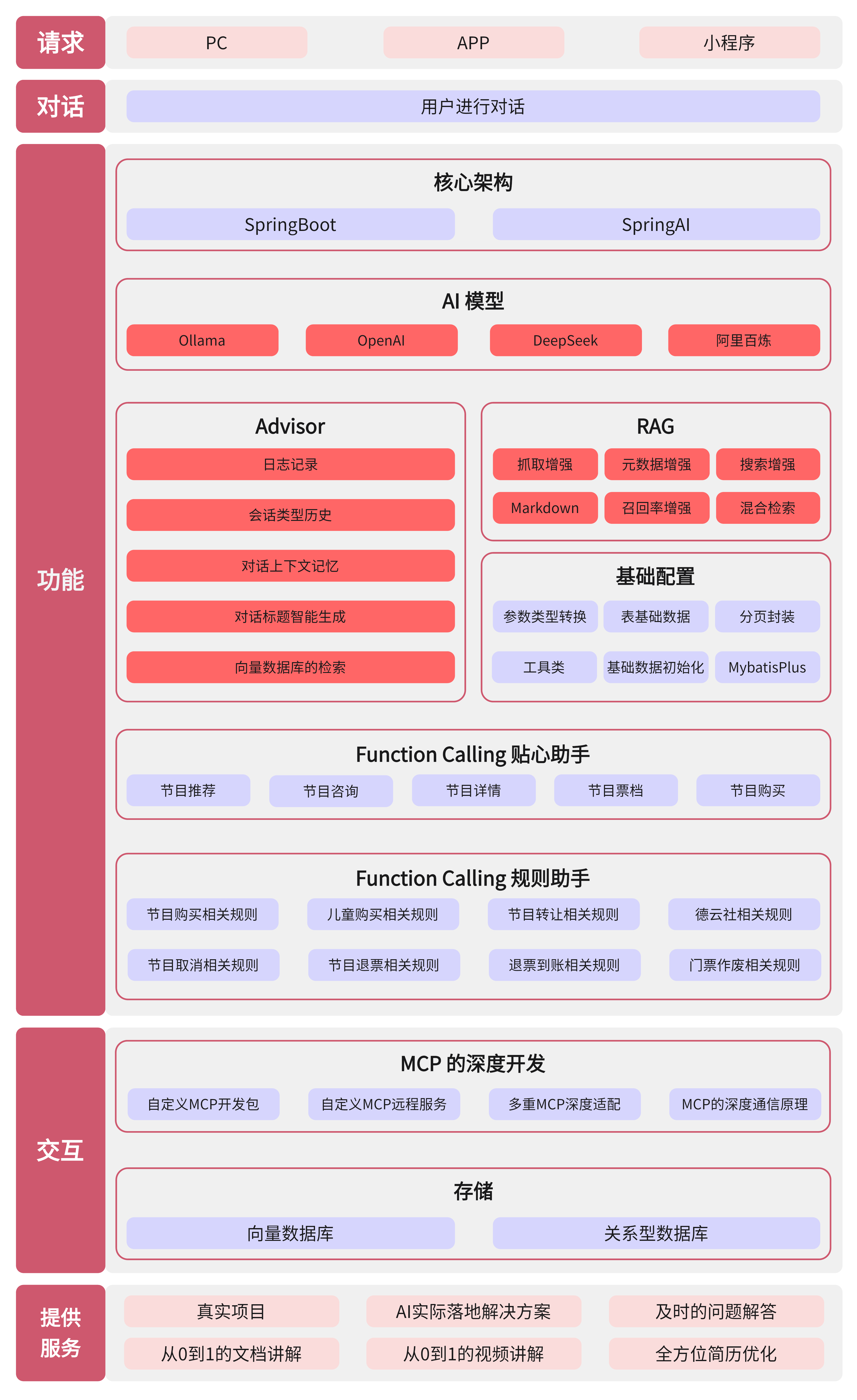 项目在使用 AI 模型时,有多个模块功能,包括 Springboot 和 SpringAI 的结合、RAG深度使用和如何自定义、 向量数据库的解释、SpringAI 操作向量数据库、MCP 和 Function Calling 操作数据、AI的拦截器 Advisor 的高阶用法 等等... ...