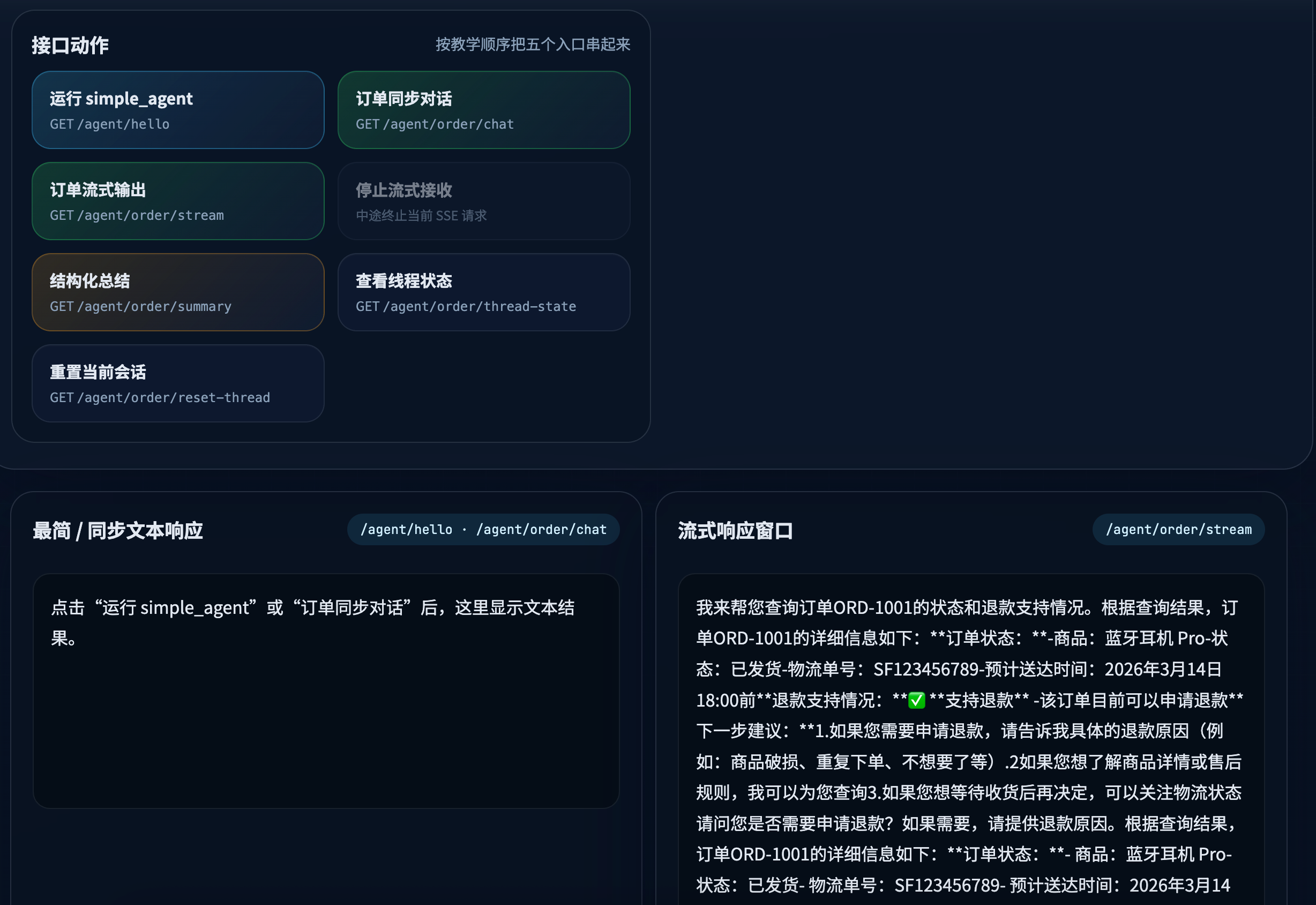 其中流式区域依然使用 fetch + ReadableStream 消费 SSE 数据,边收边渲染;如果你想观察原始协议帧,再直接访问 /agent/order/stream 即可。