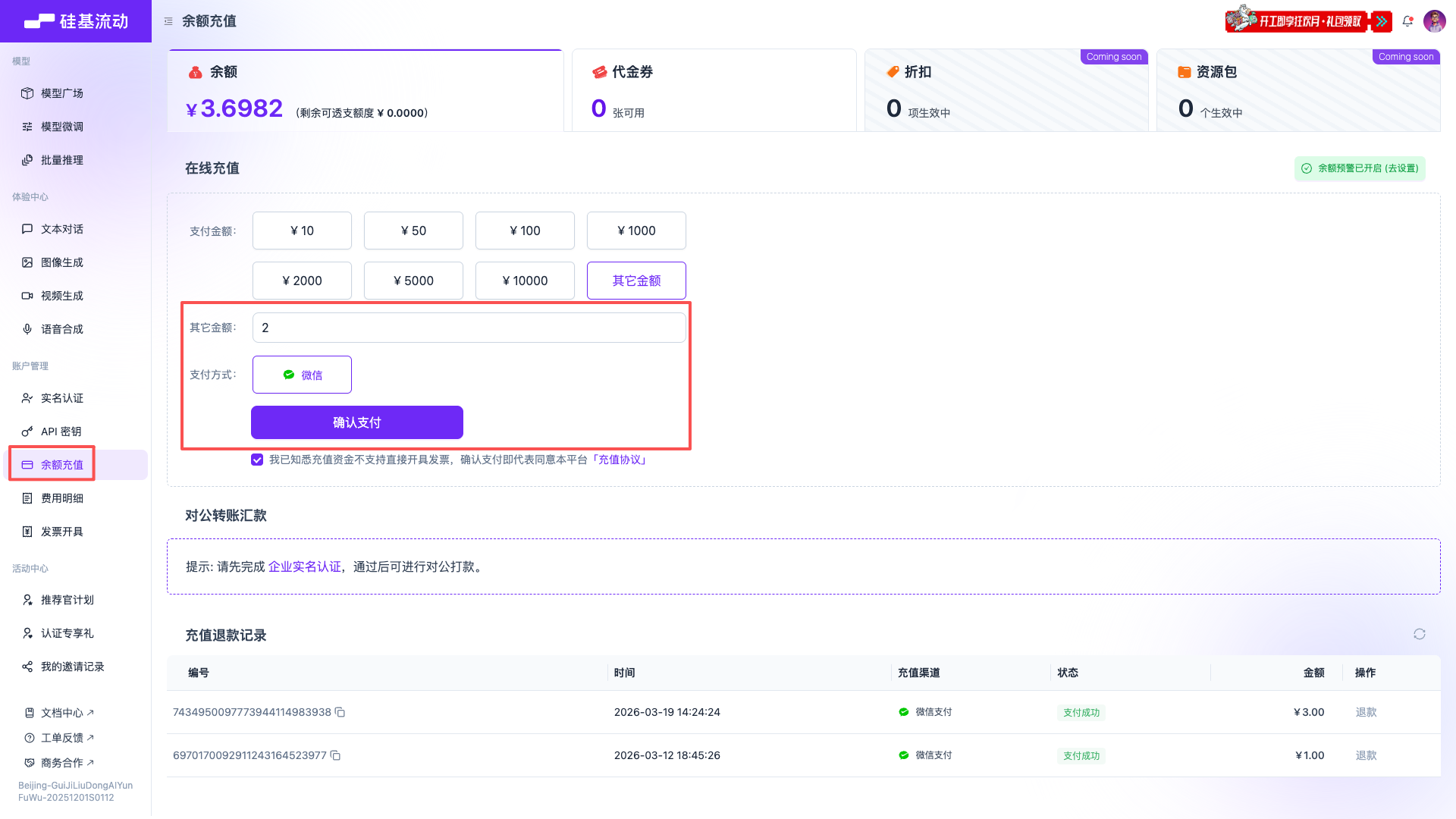 创建好api key后,并不能直接使用,需要充值才可以,也不需要充太多钱,只需1元钱就够我们用的了