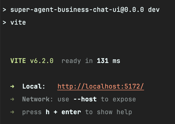 项目启动讲解前端项目部署启动本页总览前端项目部署启动 超级 AI 智能体前端项目使用vue3进行开发,nodejs版本建议 >= 16 安装nodejs(如果已经安装并且版本符合可以跳过) 非常详细的安装流程: 2023最新版Node.js下载安装及环境配置教程(非常详细)从零基础入门到精通,看完这一篇就够了_nodejs安装及环境配置-CSDN博客 安装完成后输入如下命令,出现版本信息说明安装成功 启动前端项目 进入到 super-agent/vue 的目录后,开始执行命令 安装项目需要的依赖 npm install 启动项目 npm run dev 出现启动成功页面
