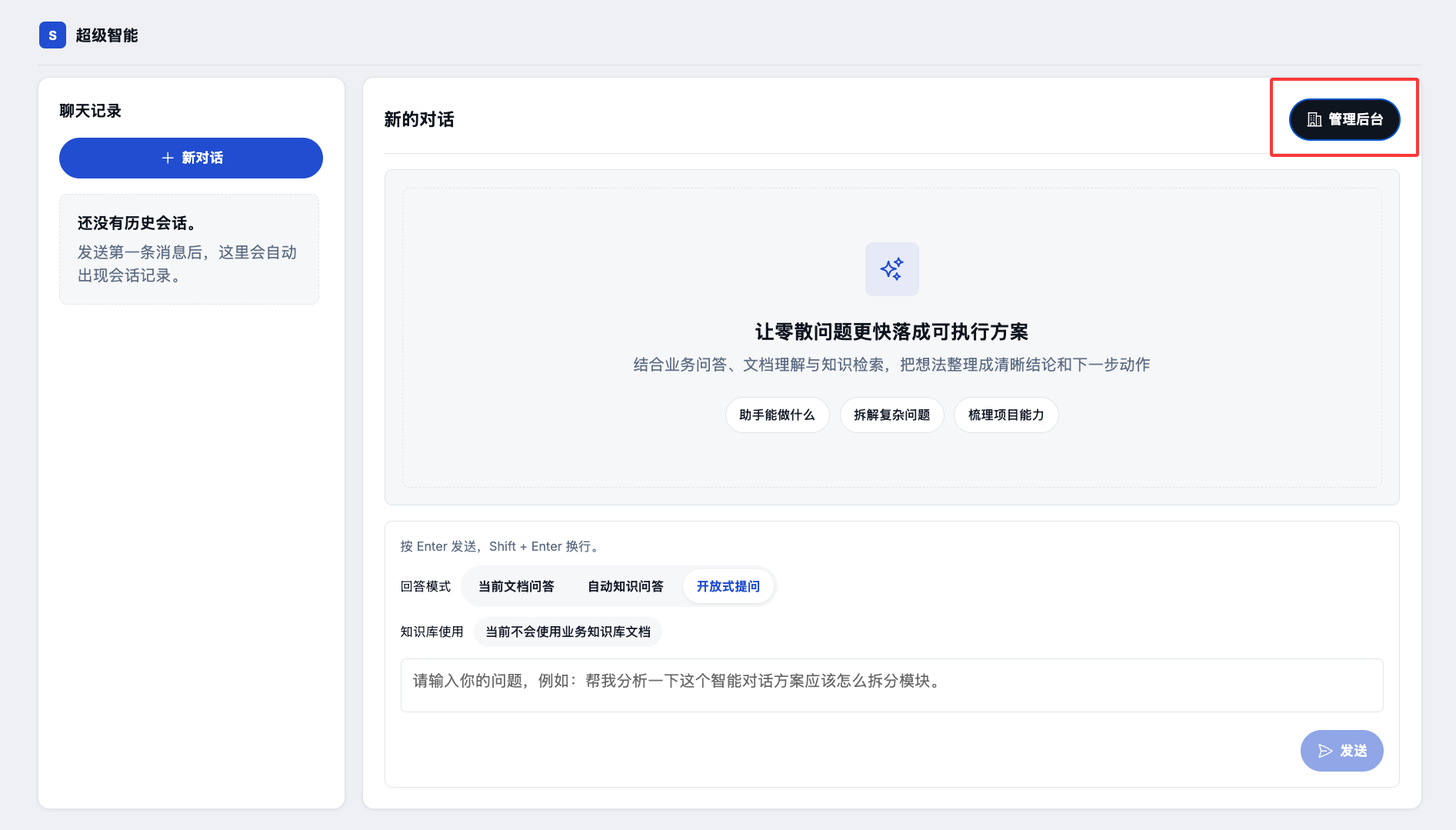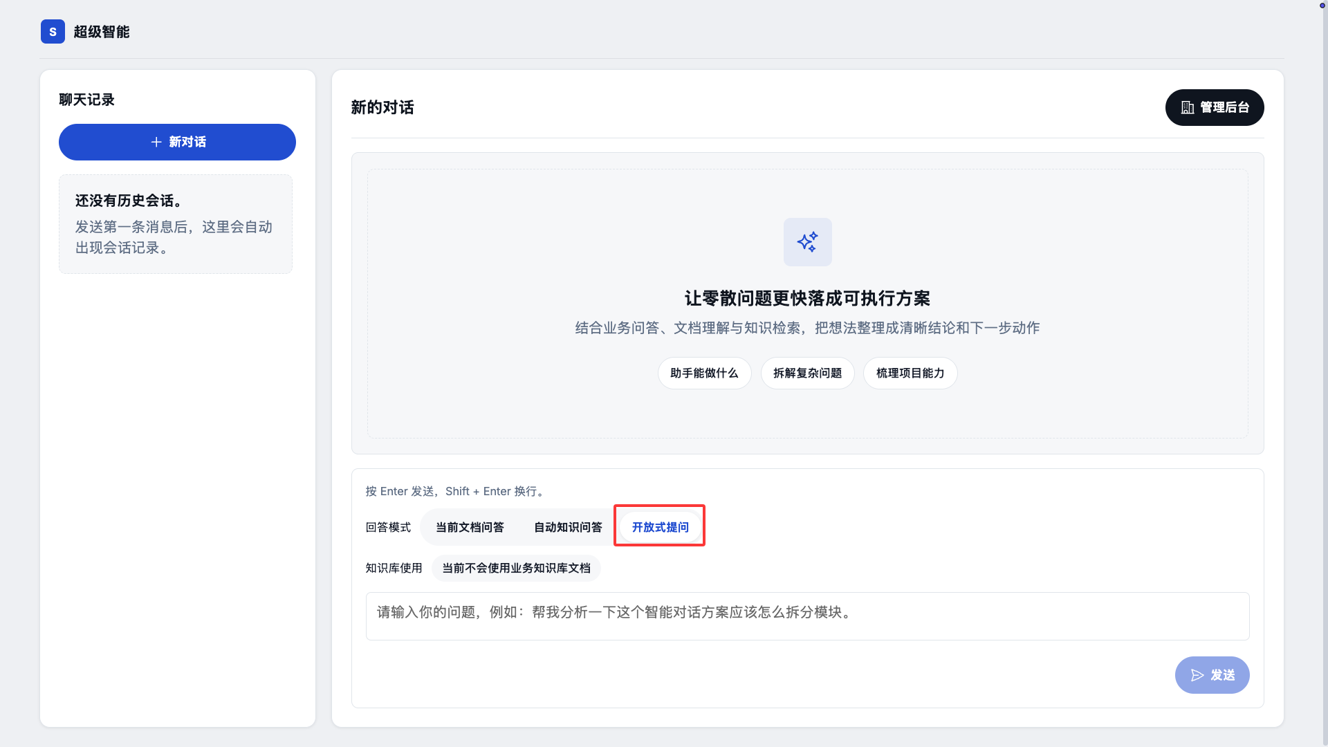 有时用户并不想检索内部资料,而是需要联网搜索一些外部的信息来回答用户的问题,这时就可以使用开放式提问模式,系统会自动调用外部的搜索引擎来获取相关的信息来回答用户的问题。