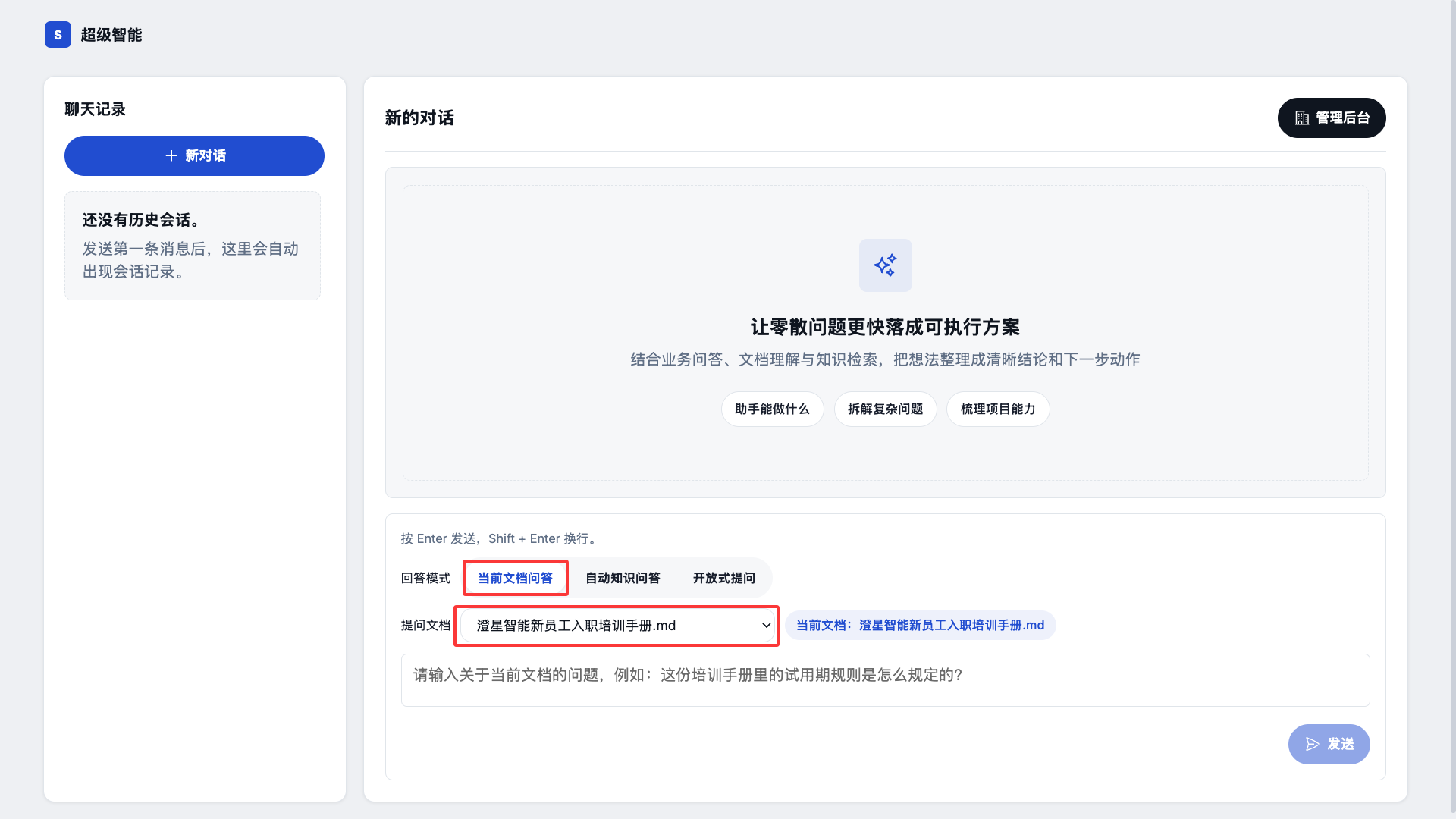 用户需要先选择某个文档后,进行对话,这样是可以最为精确的检索和智能联想整个文档中的内容
