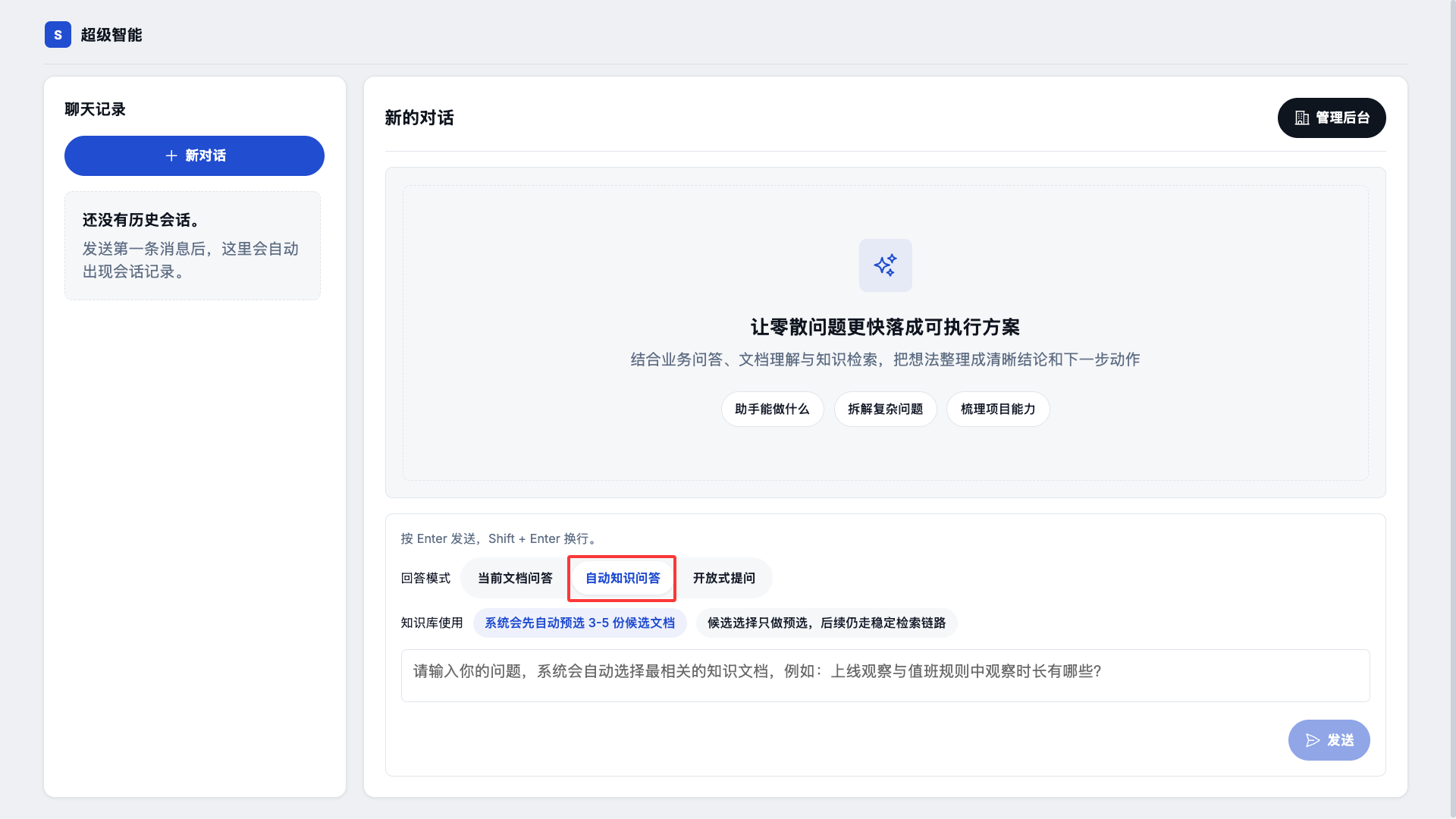用户无需选择文档,系统会自动根据用户的提问进行相关文档的检索和联想,来回答用户的问题。