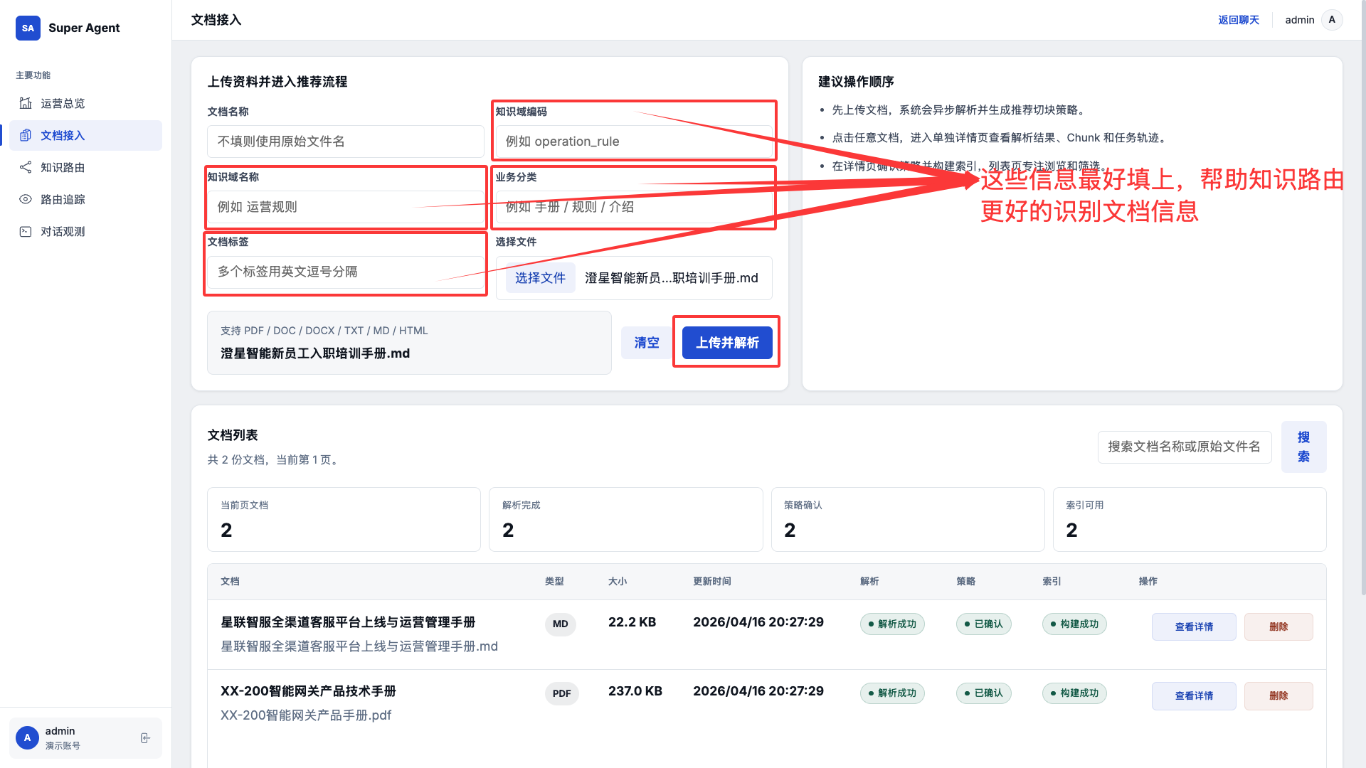 3. 选择文件后,填写对应的知识路由相关的信息,点击上传并解析