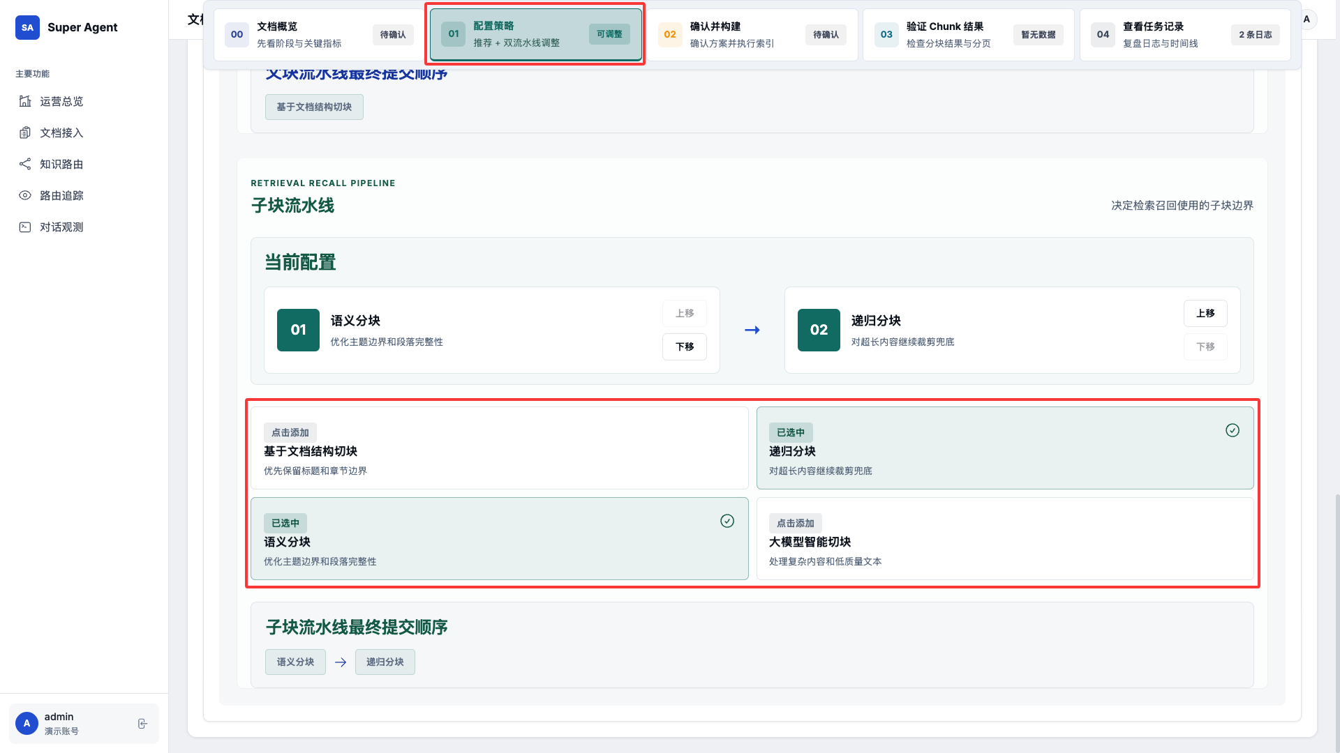 这里是调整父块的切分方式,有图中的四种拆分方式,系统会根据文档内容自动推荐,一般用推荐就可以了。当然也可以根据自己的需求进行额外调整
