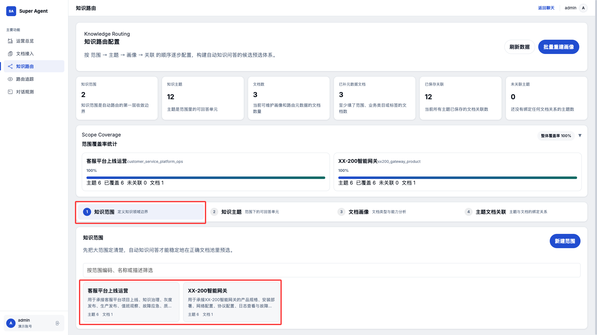 下面的 范围覆盖率统计 会展示每个知识范围的覆盖情况。可以看到 客服平台上线运营 和 XX-200智能网关 两个范围,并且每个范围下还能直接看到:
