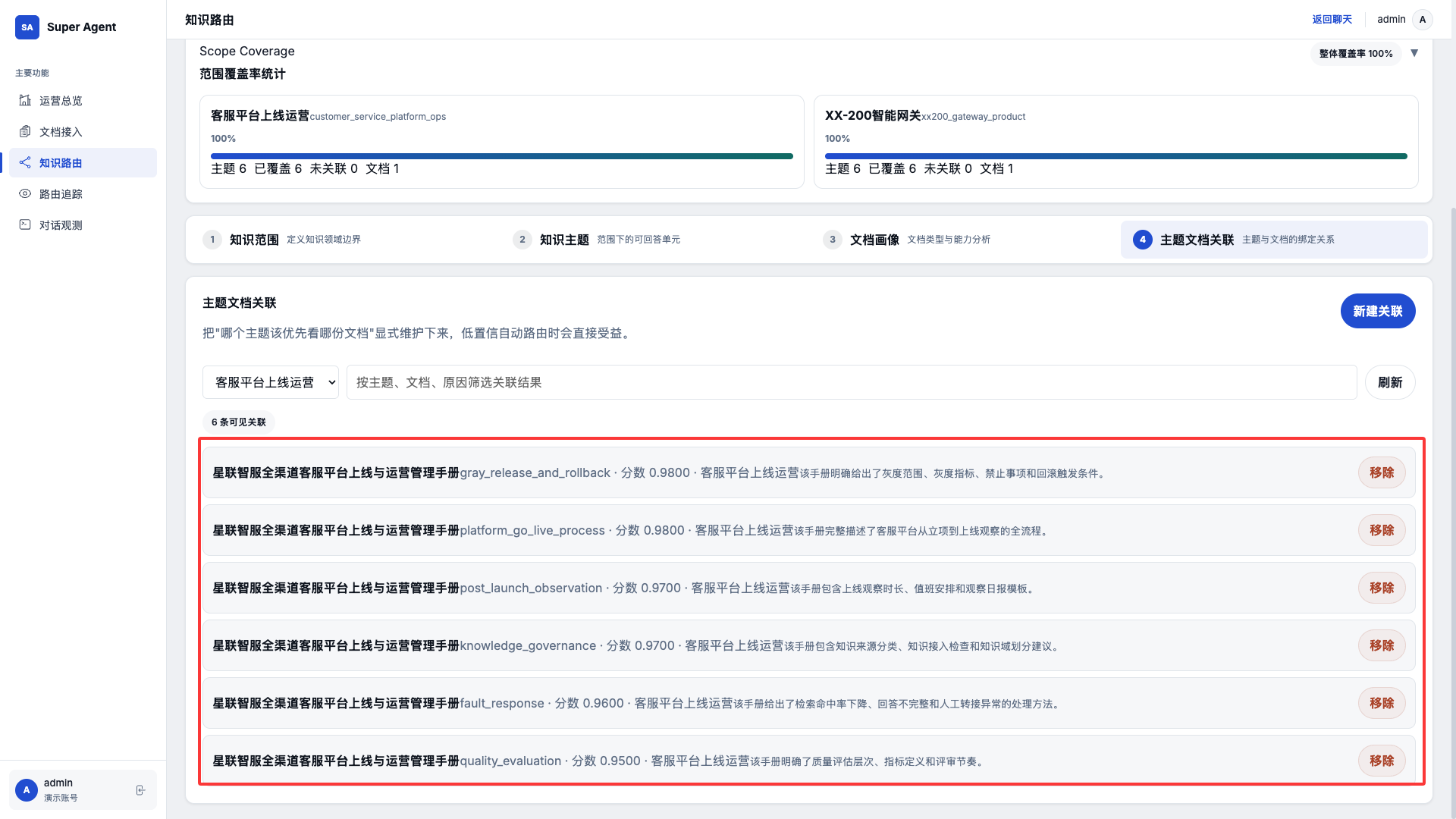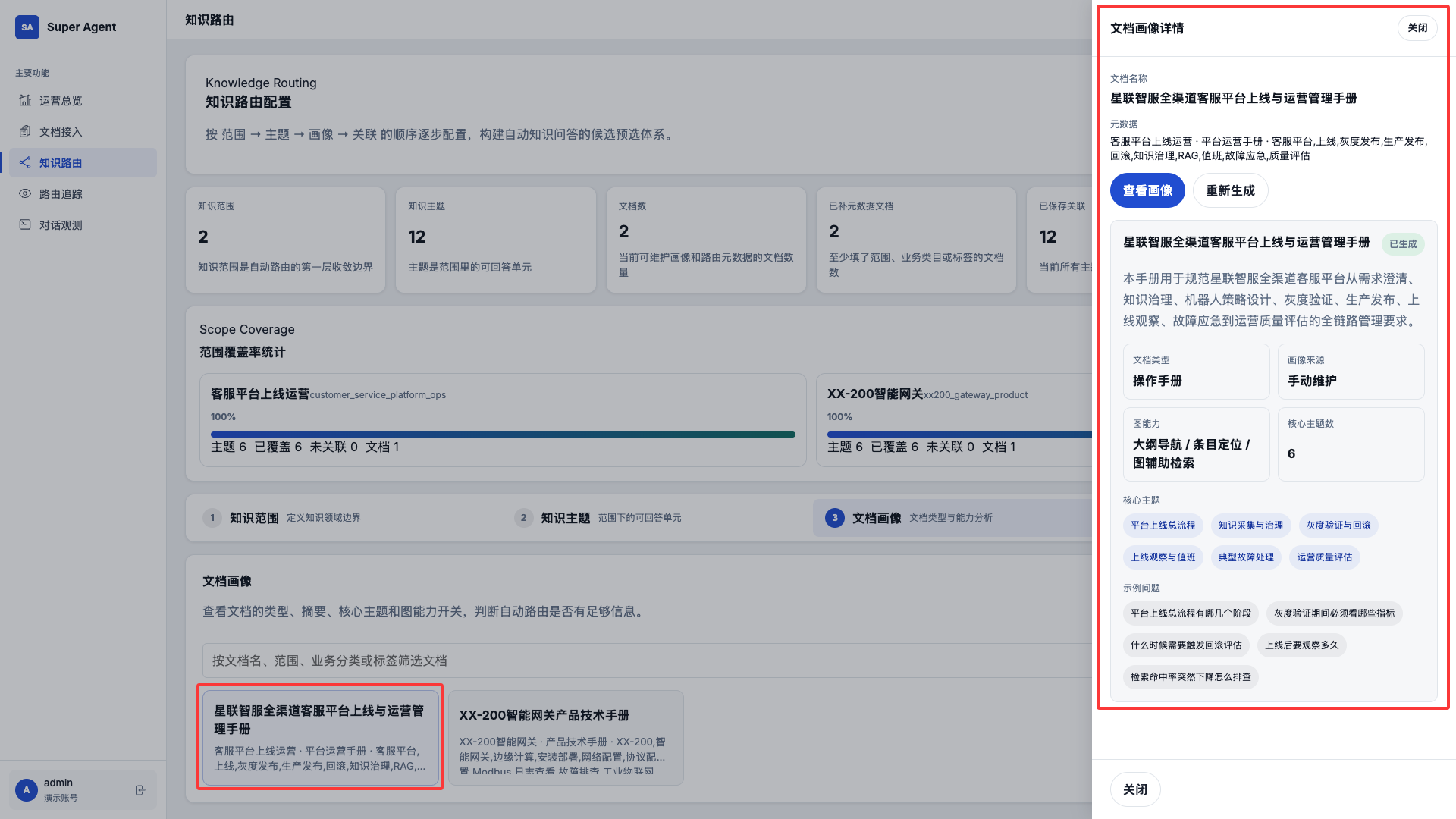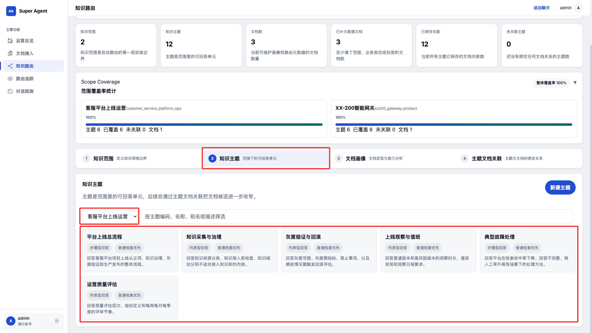 知识范围:当前已经配置了多少个大类边界知识主题:范围下面已经沉淀了多少个可回答单元文档数:当前参与知识路由画像和元数据维护的文档数已补元数据文档:至少填写了范围、业务类目或标签的文档数已保存关联:已经建立好的主题和文档关联数量未关联主题:还没有绑定任何文档的主题数量