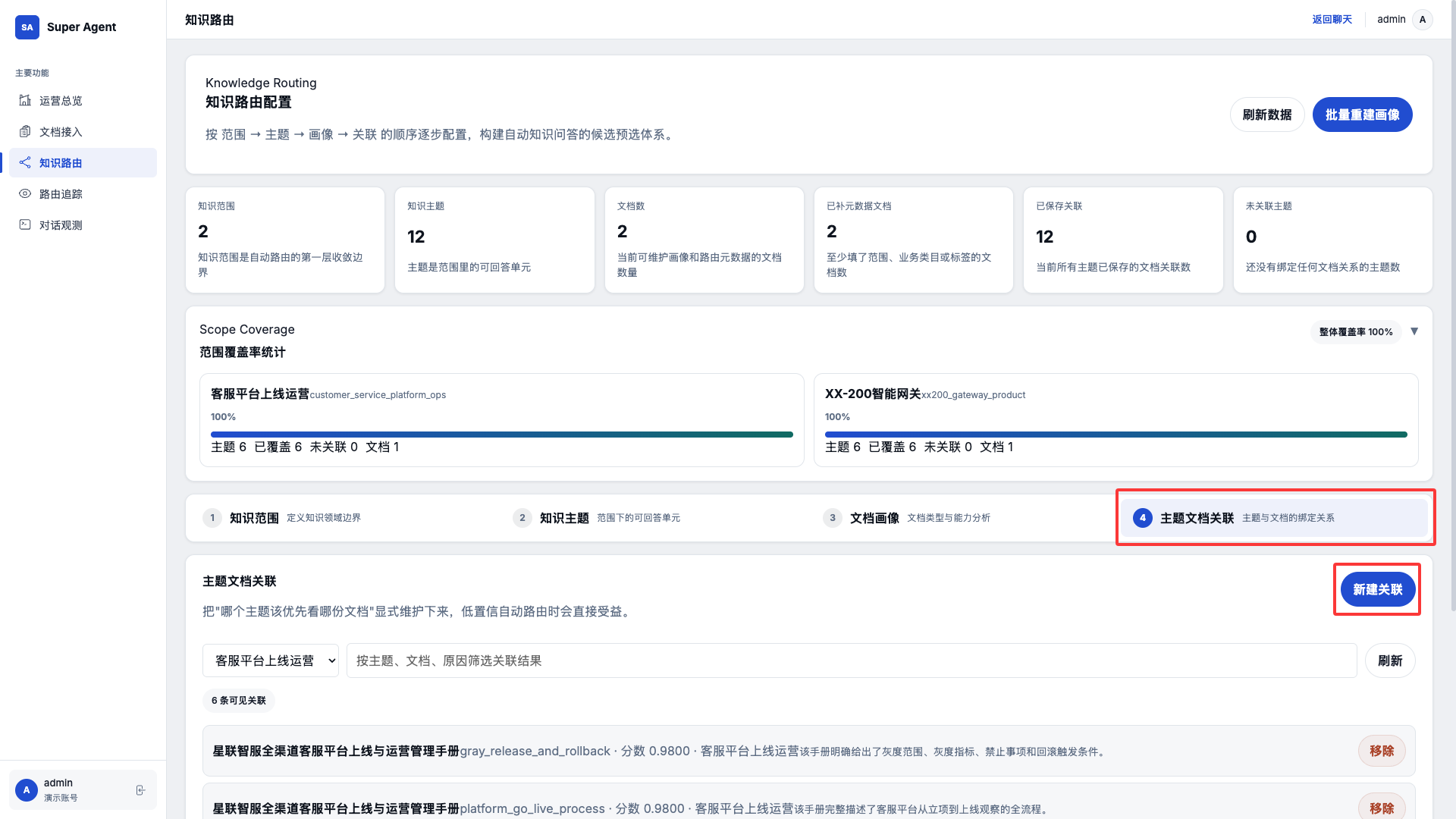 在页面上,也是按 范围 -> 主题 -> 画像 -> 关联 的顺序来配置的。只要把这四步配置清楚,后面的自动知识问答就能更稳定地命中正确文档。