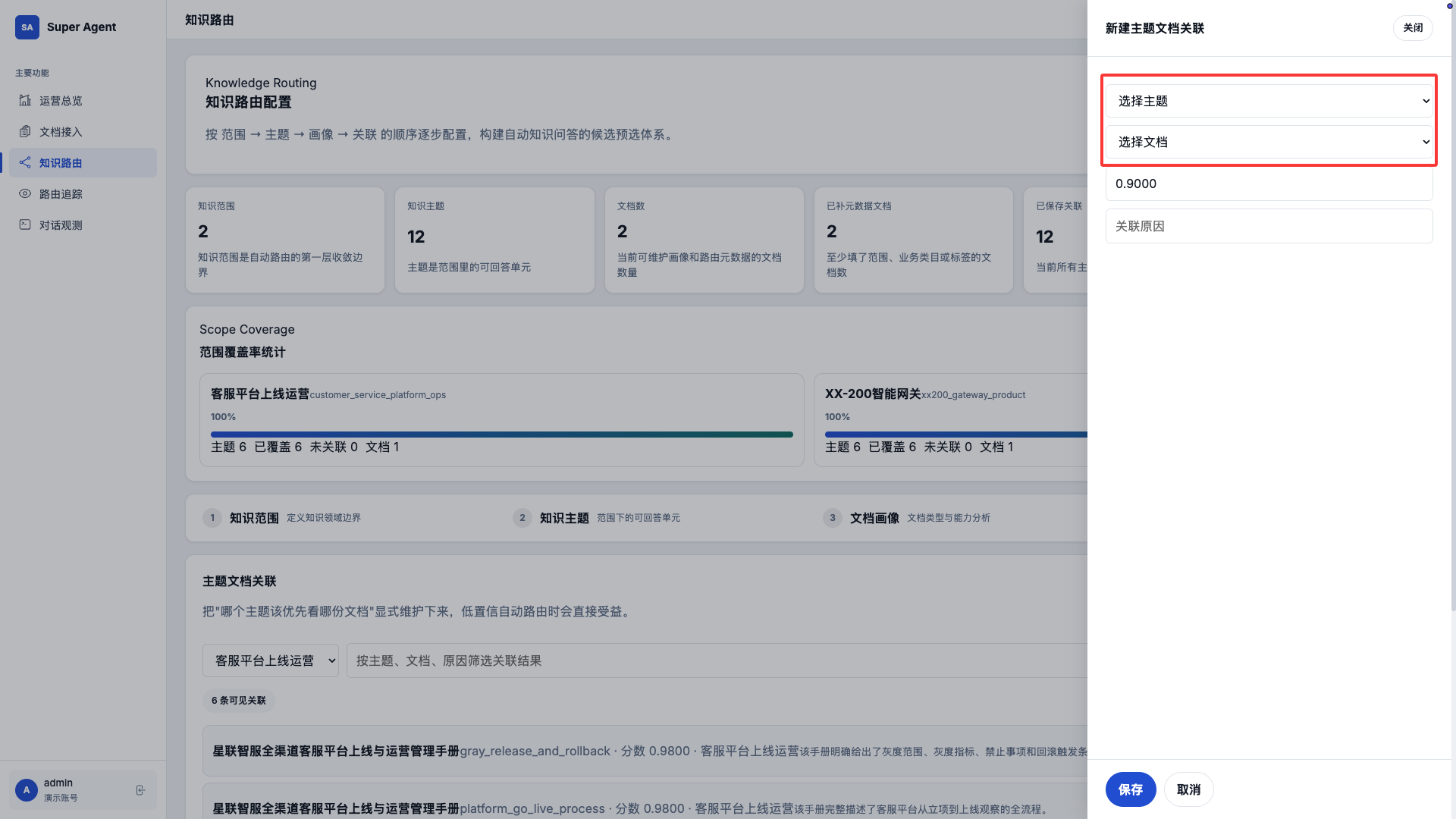 主题:告诉系统你要绑定的是哪一个知识主题文档:告诉系统这个主题最应该优先参考哪篇文档分数:代表这条关联关系的强弱,分数越高,通常优先级越高关联原因:建议写清楚“为什么这篇文档适合这个主题”,便于后续排查和维护