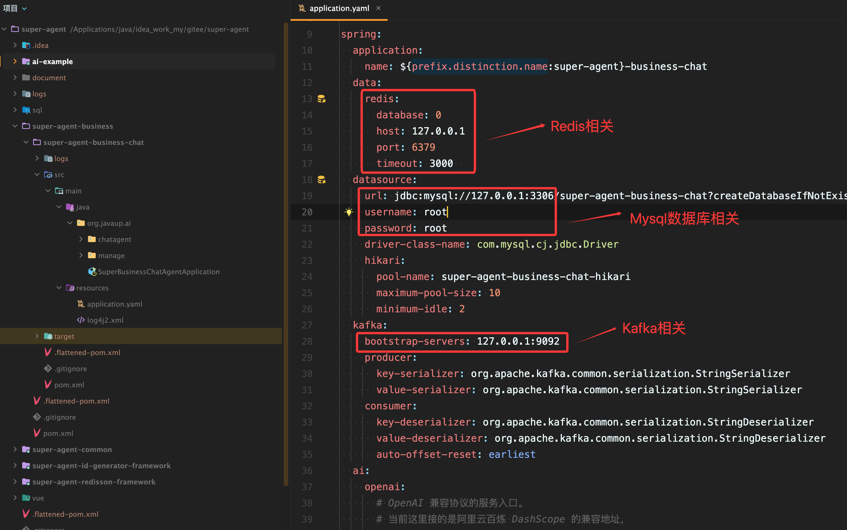项目中依赖了Mysql、Redis、kafka、向量数据库 的相关中间件,可参考下列文档直接使用本人提供的中间件云环境地址或者本地搭建