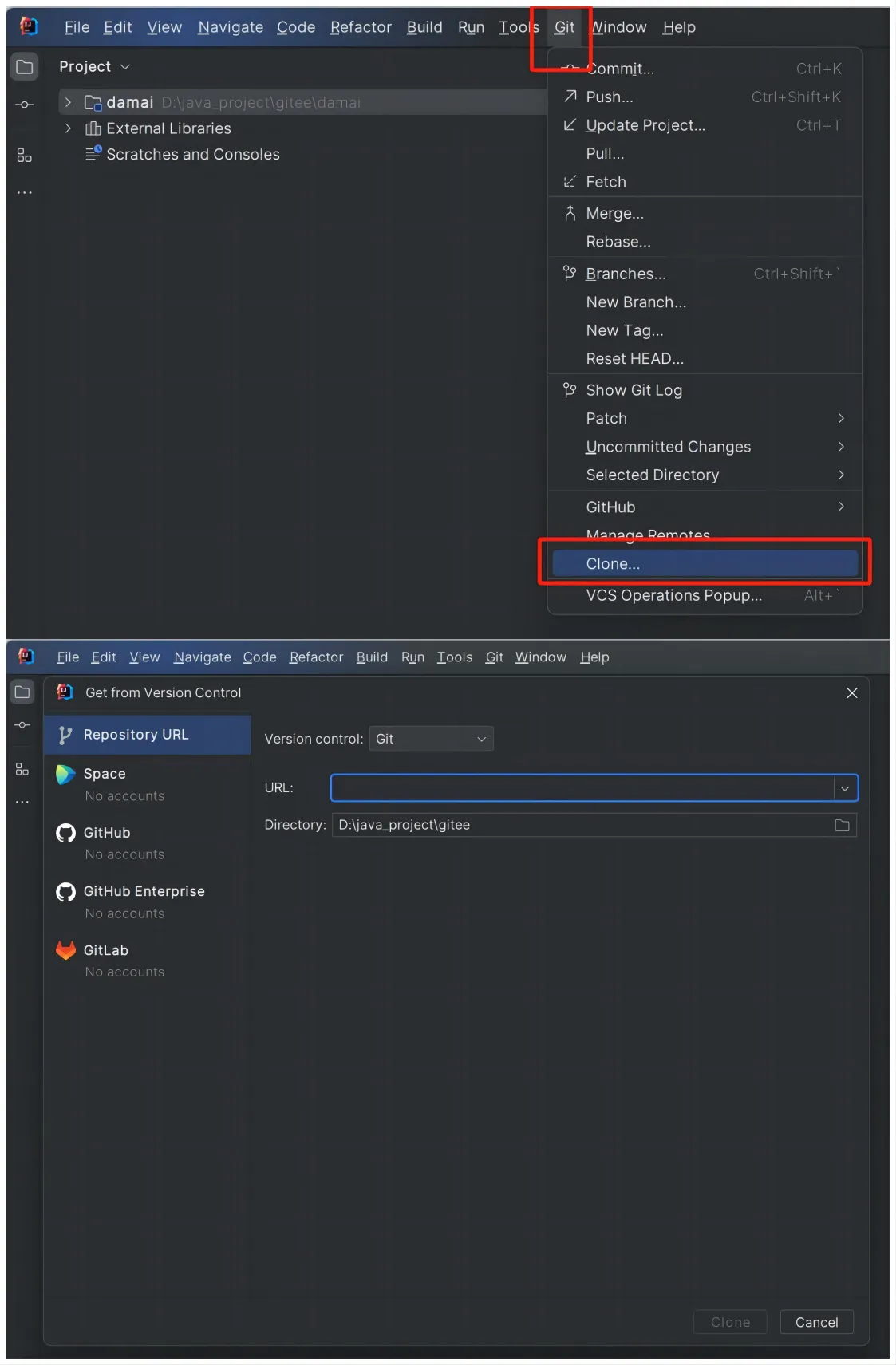 通过 IntelliJ IDEA将项目导入,URL为项目的https或者ssh地址,Directory为项目的目录,当项目克隆下来后,等待IntelliJ IDEA通过maven将项目构建完毕