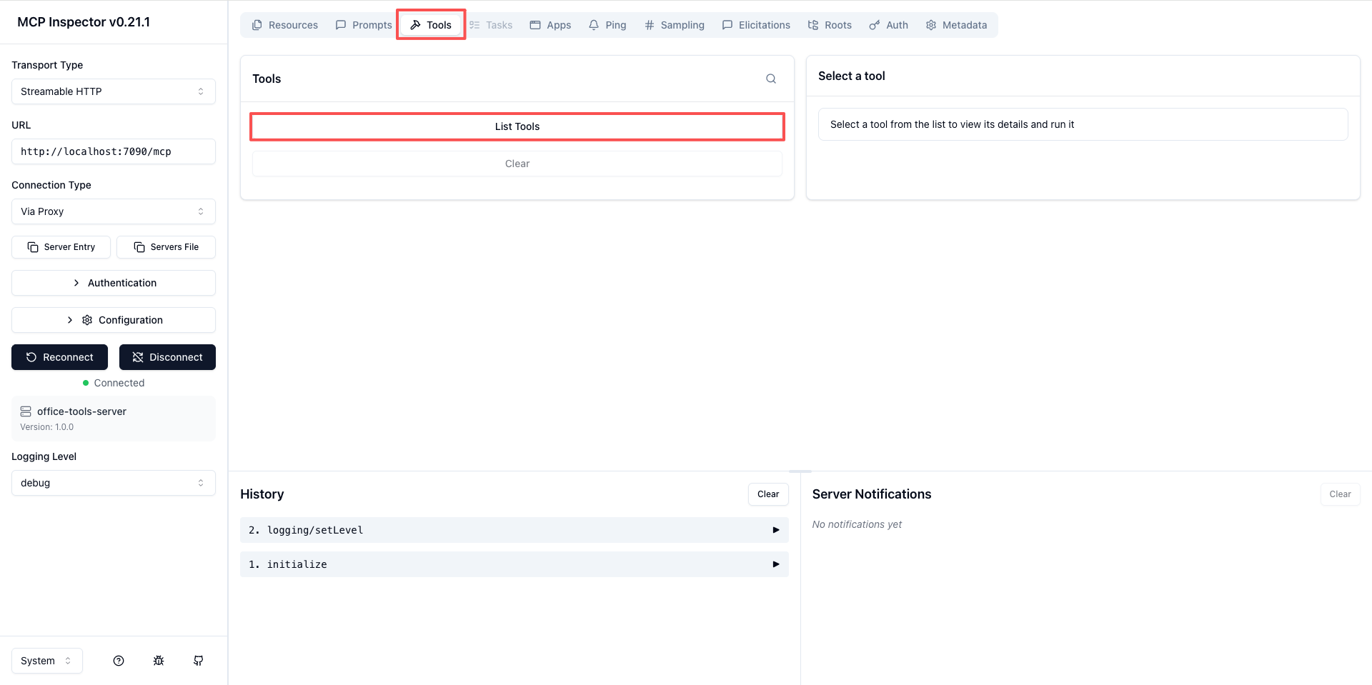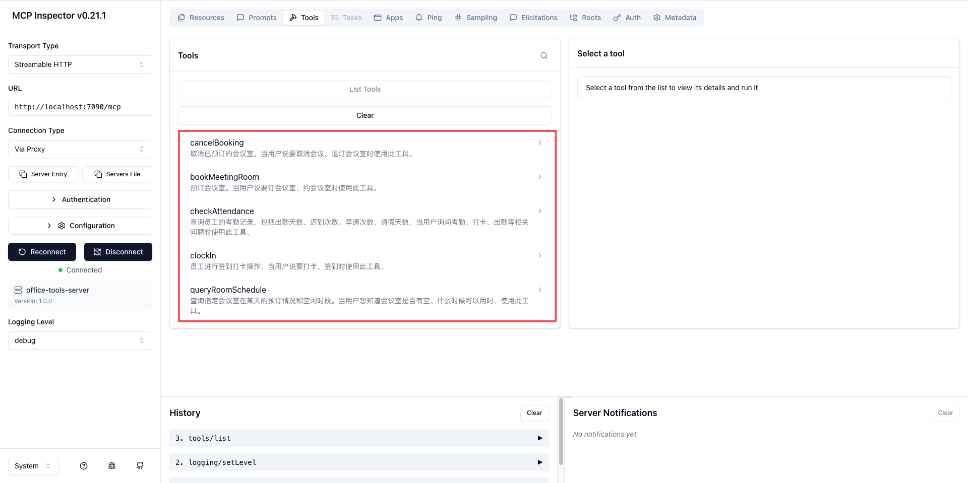连接成功后,点击Tools标签页,可以看到我们注册的所有工具。