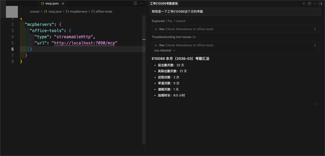 @Tool(description = "查询员工的考勤记录,包括出勤天数、迟到次数、早退次数、请假天数。" +