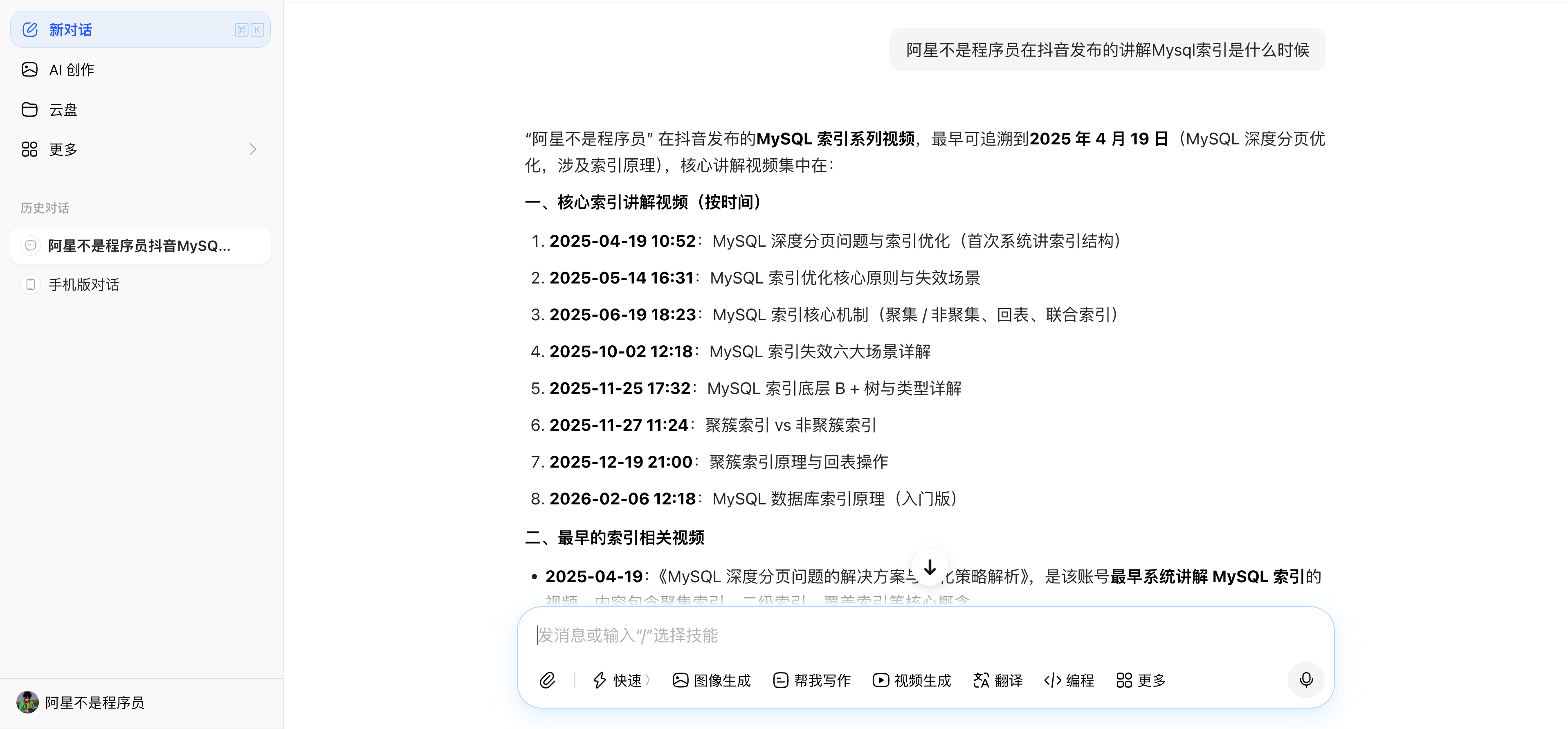 比如我问:阿星不是程序员在抖音发布的讲解Mysql索引是什么时候?