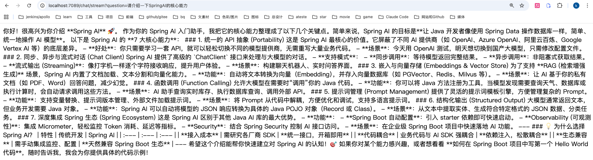 启动应用后,访问 http://localhost:7089/chat/stream?question=请介绍一下SpringAI的核心能力 就能看到 AI 的流式回答了。