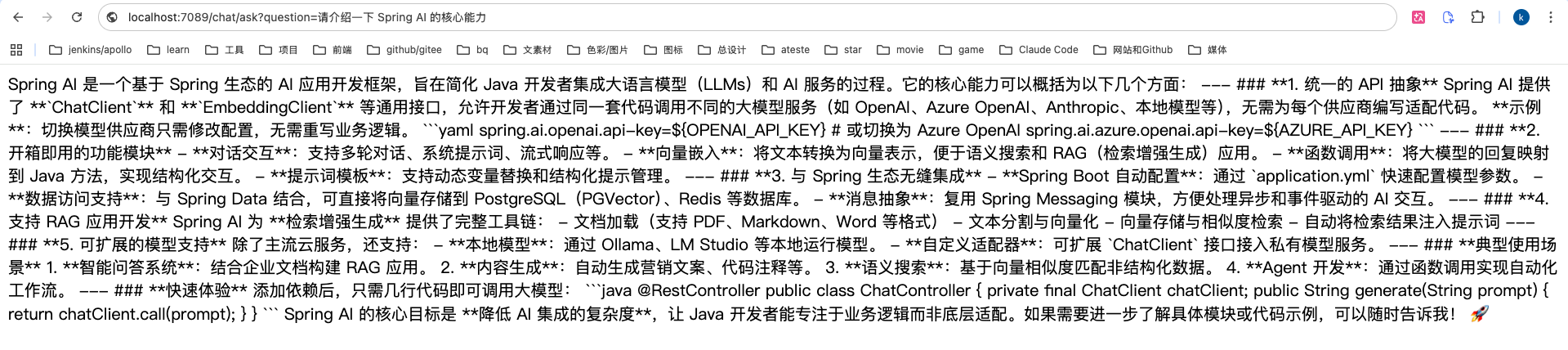 启动应用后,访问 http://localhost:7089/chat/ask?question=请介绍一下SpringAI的核心能力 就能看到 AI 的回答了。