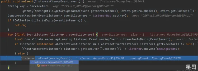 可以看到for循环中的listener就是NacosWatch中的eventListener,然后就执行onEvent中的逻辑了。