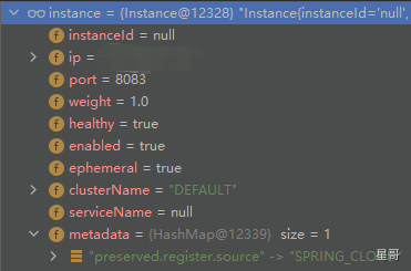可以看到Instance就是服务实例,包括了ip地址、port端口号、weight权重、healthy健康、ephemeral是否临时节点、clusterName集群名字等。