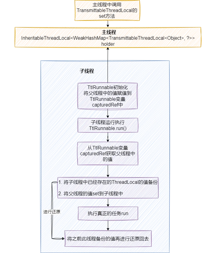 开启循环,每个循环中主线程使用InheritableThreadLocal进行设置,使用线程池来进行取值,解决线程复用产生的问题