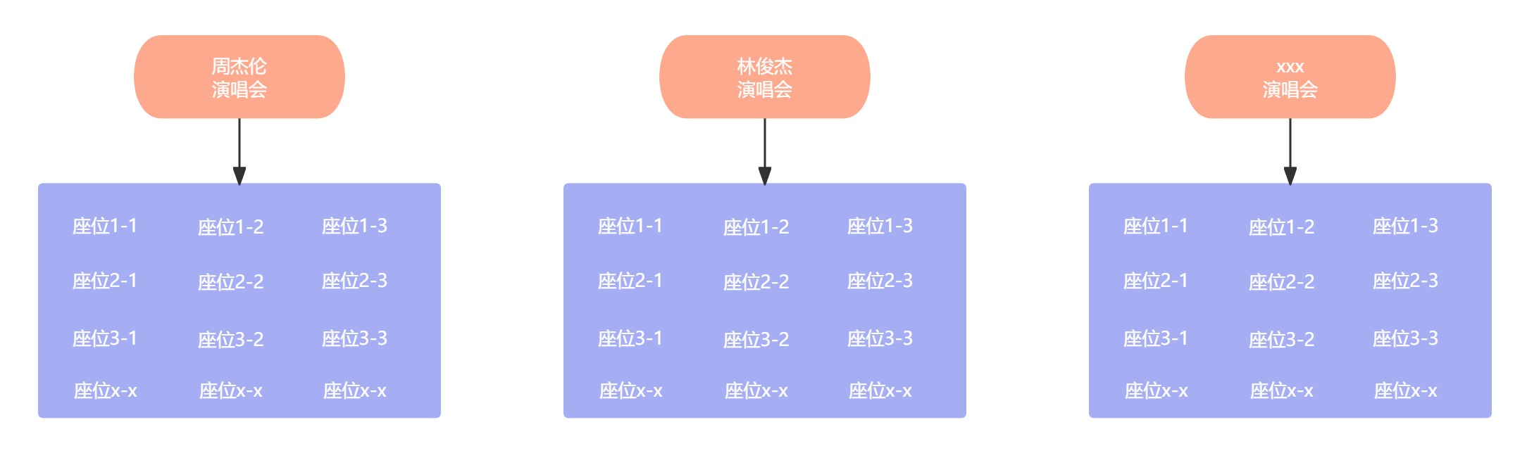 关于座位的数据存放问题要结合缓存和数据库的设计一起来考虑,在数据库中座位肯定是要跟演唱会相关联的,也就是多对一的关系 而在缓存中的设计思路同样也是将如此,具体的设计可以用下图来表示: