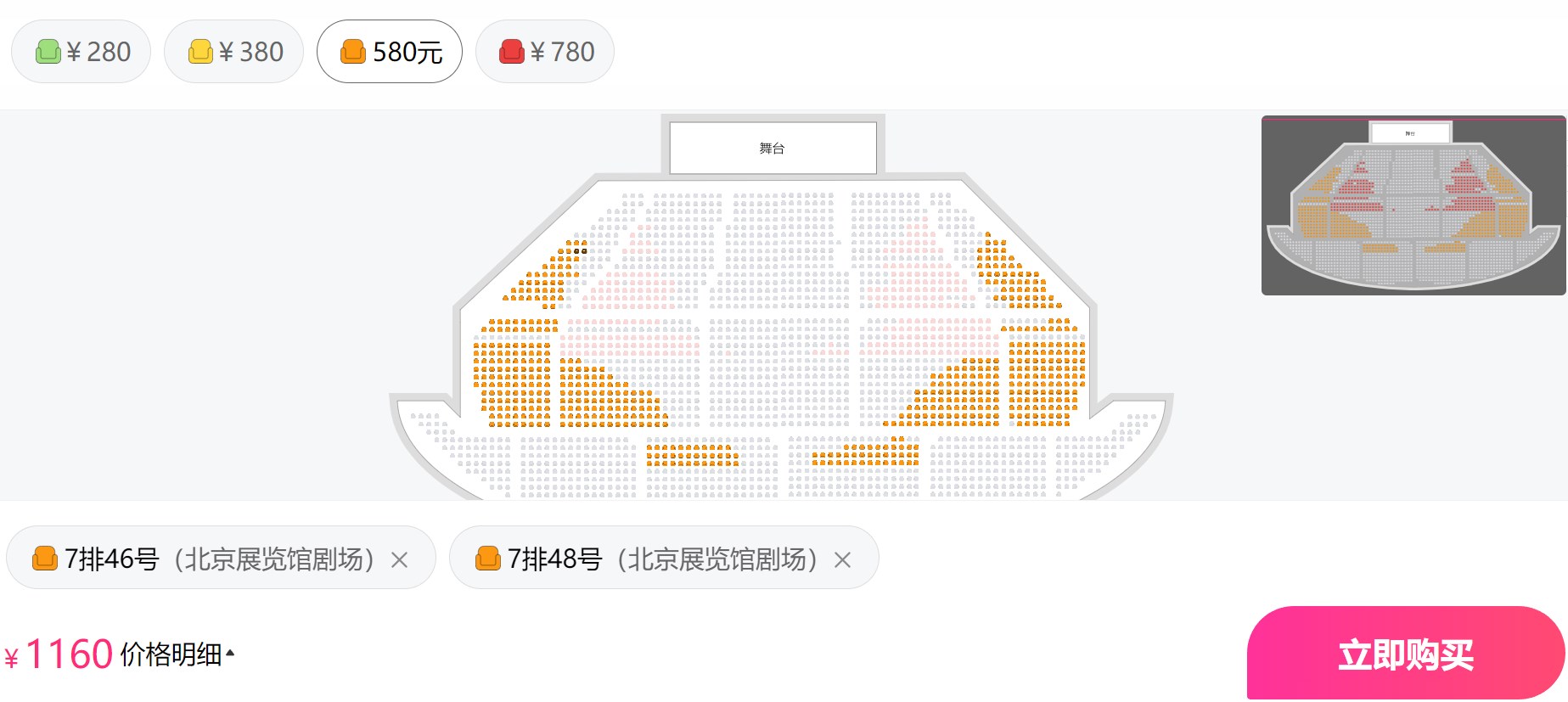 在查看节目座位时,如果节目可以选择座位的话,在节目详情页面会有可选座的说明