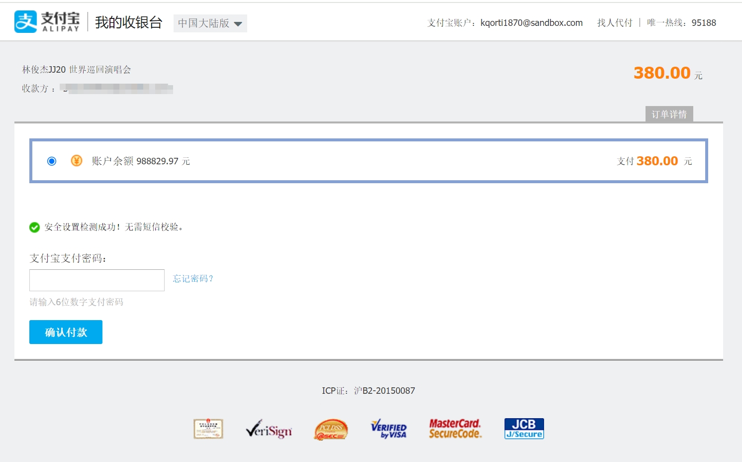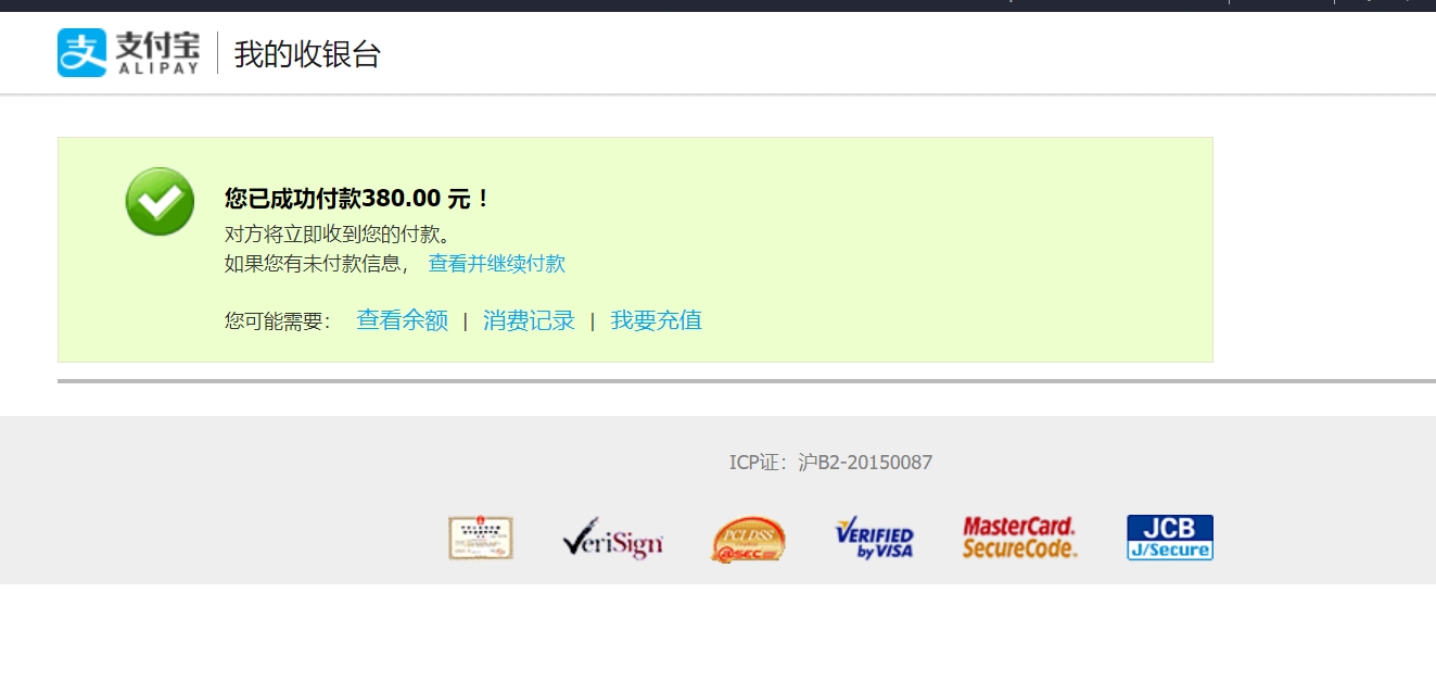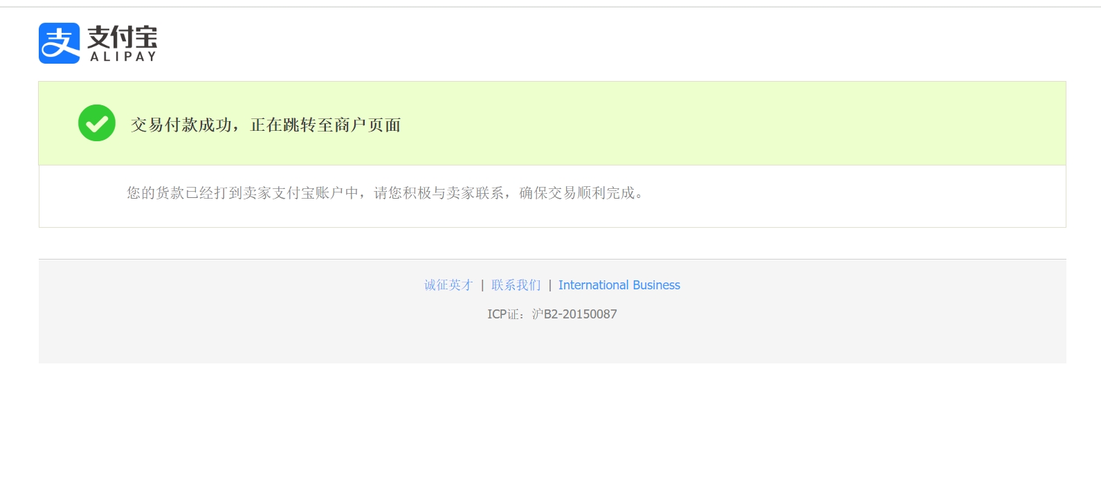 当输入支付宝账号和支付密码后,支付宝会跳转到支付宝的成功付款页面,然后过几秒会跳转到付款成功,正在跳转商河页面,接着会跳转到我们自己的支付成功页面