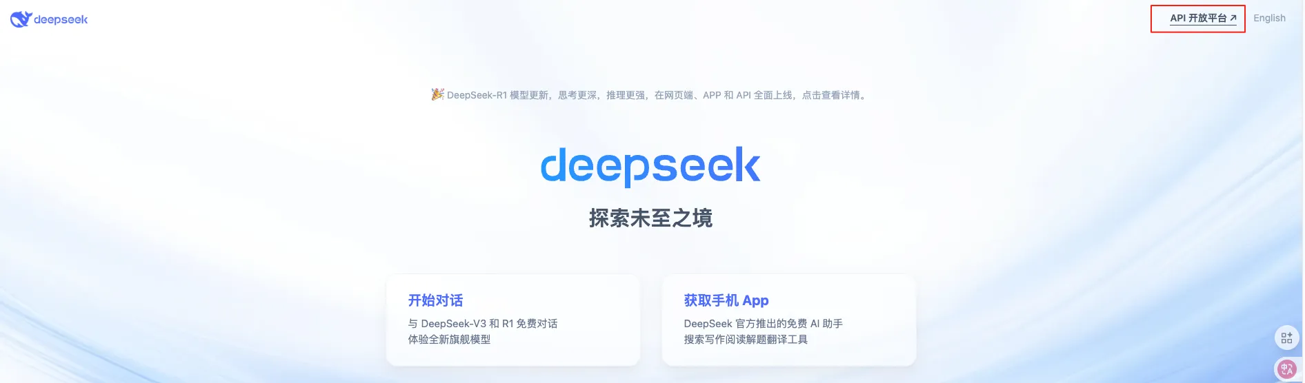 进入DeepSeek官网地址:https://www.deepseek.com/,然后点击右上角API开放平台
