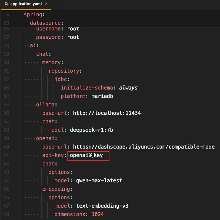 在 application.yaml 中配置阿里百炼的API-key,把openai的key替换成你创建的真正的API-key