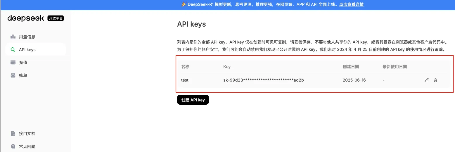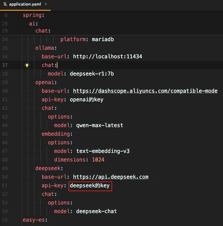 在 application.yaml 中配置DeepSeek的API-key,把deepseek的key替换成你创建的真正的API-key