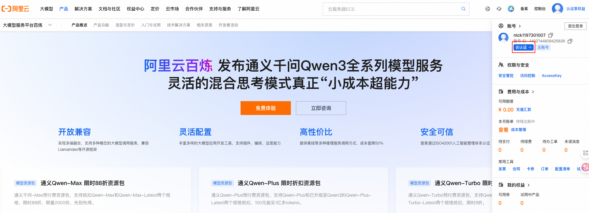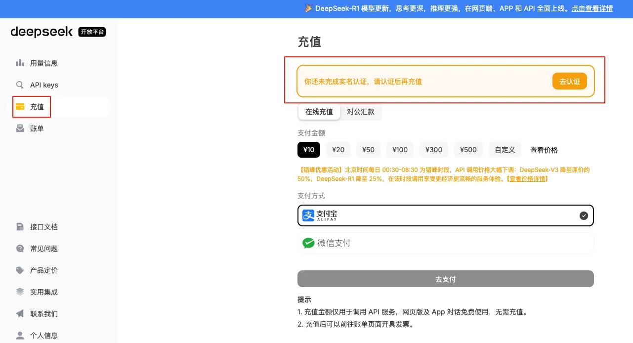 创建好api key后,并不能直接使用,需要充值才可以,也不需要充太多钱,只需1元钱就够我们用的了