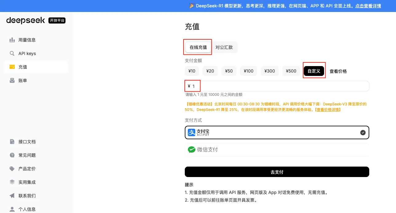 选择 在线充值,支付金额选择 自定义,充值1元,然后选择支付宝或者微信进行支付就可以了