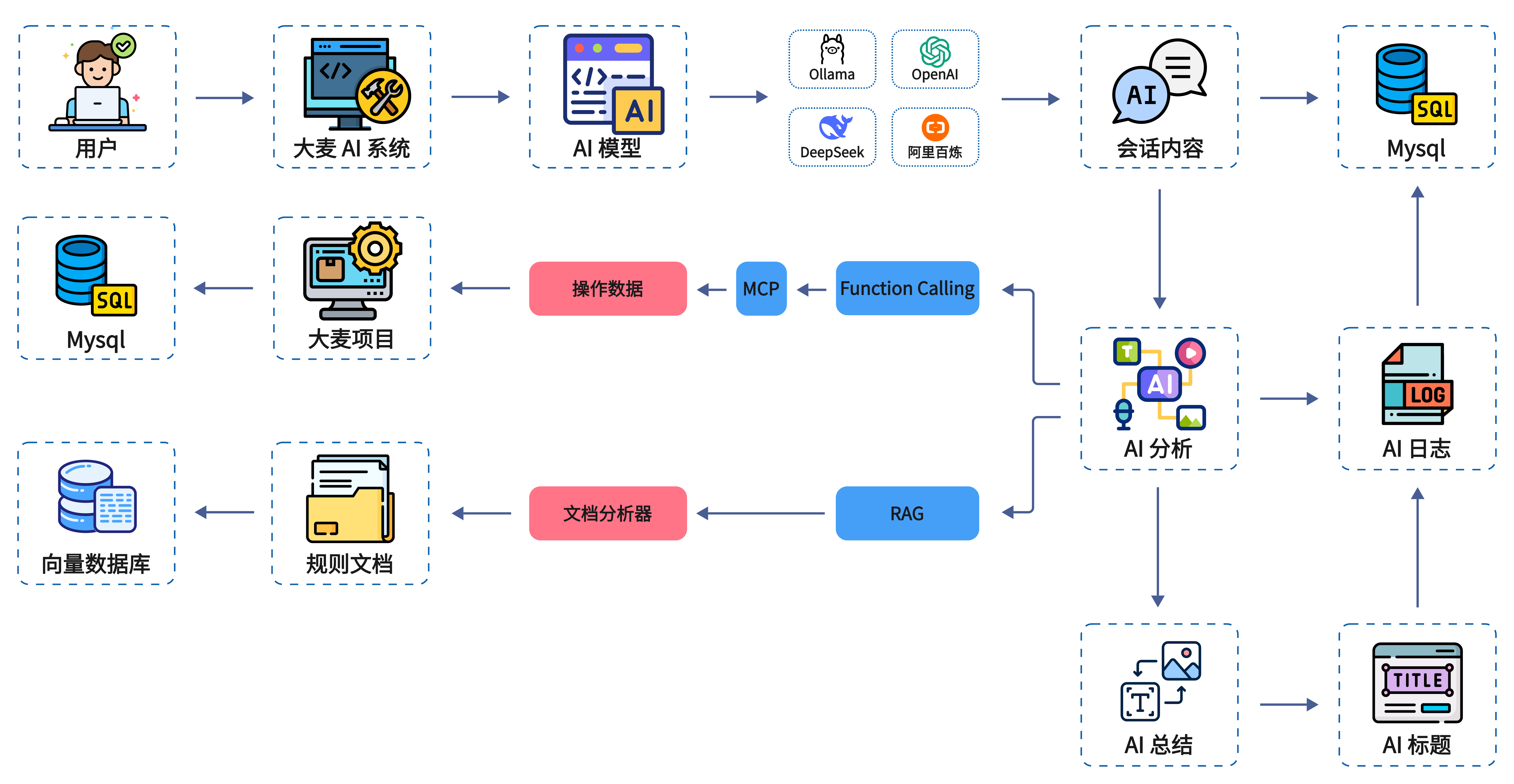 大麦AI 就是做到了和之前开发的 大麦 进行联动,大麦 负责高并发业务的逻辑执行,大麦AI 负责和用户进行高度智能的交互。