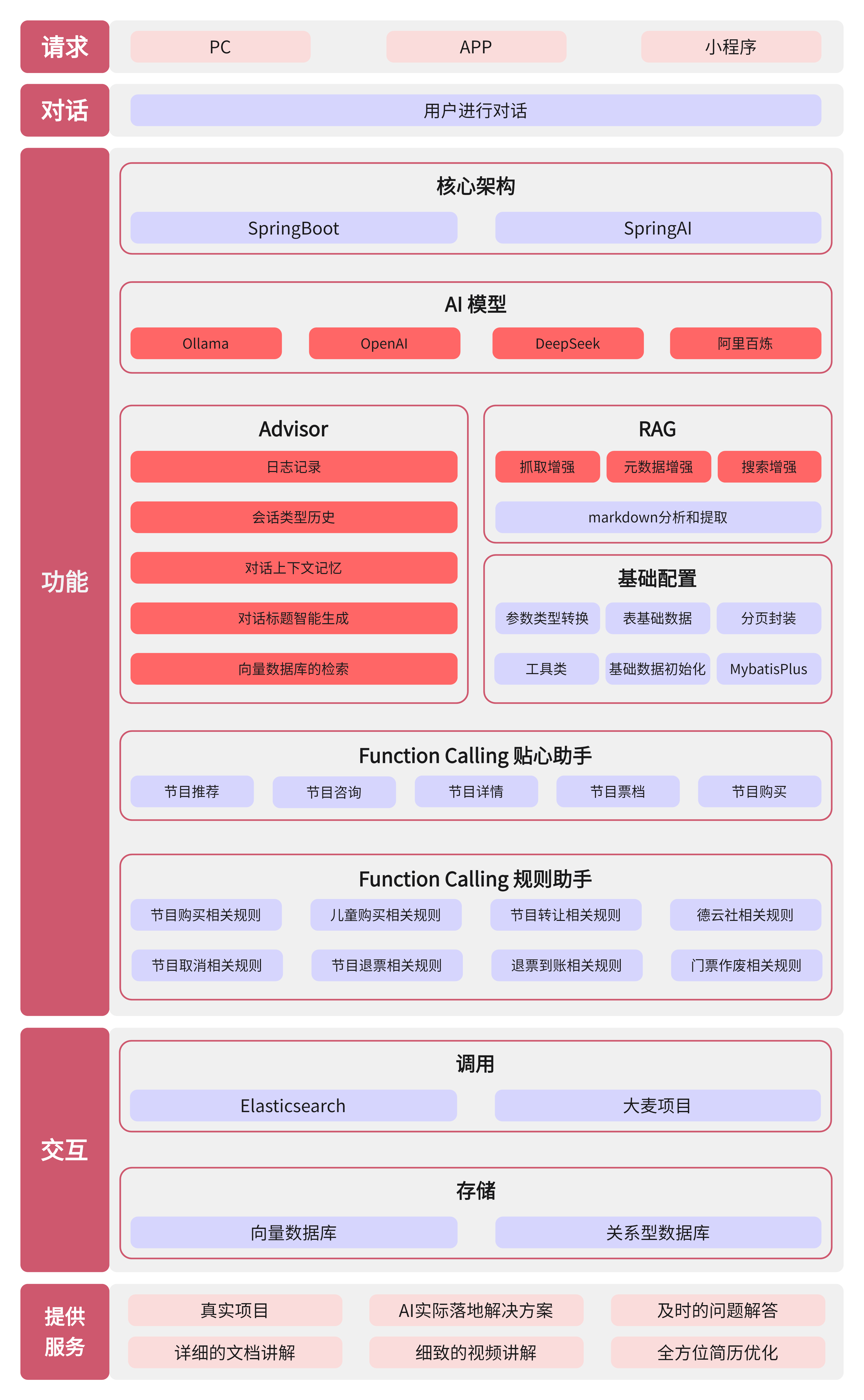 项目在使用 AI 模型时,有多个模块功能,包括 Springboot 和 SpringAI 的结合、RAG 和向量数据库的解释、SpringAI 操作向量数据库、MCP 和 Function Calling 操作数据、AI的拦截器 Advisor 的高阶用法 等等... ...