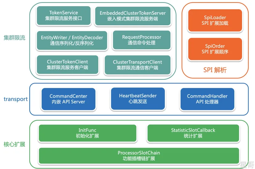 开发者可以在用同一个 sentinel-core 的基础上自行扩展接口实现,从而可以方便地根据业务需求给 Sentinel 添加自定义的逻辑。目前 Sentinel 提供如下的扩展点: