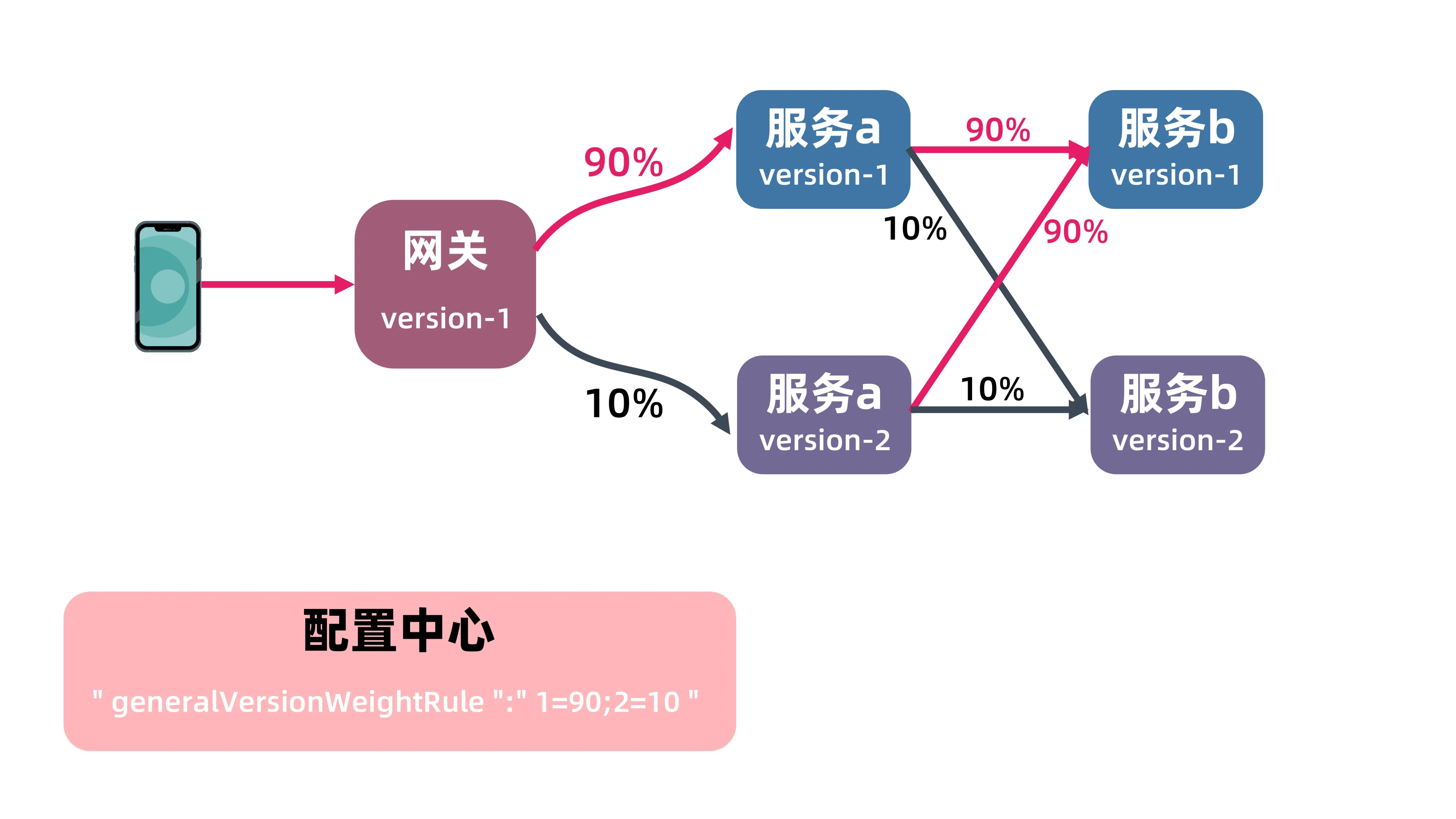 - 在a服务中,version-1版本的a服务权重为90,version-2版本的a服务权重为10
