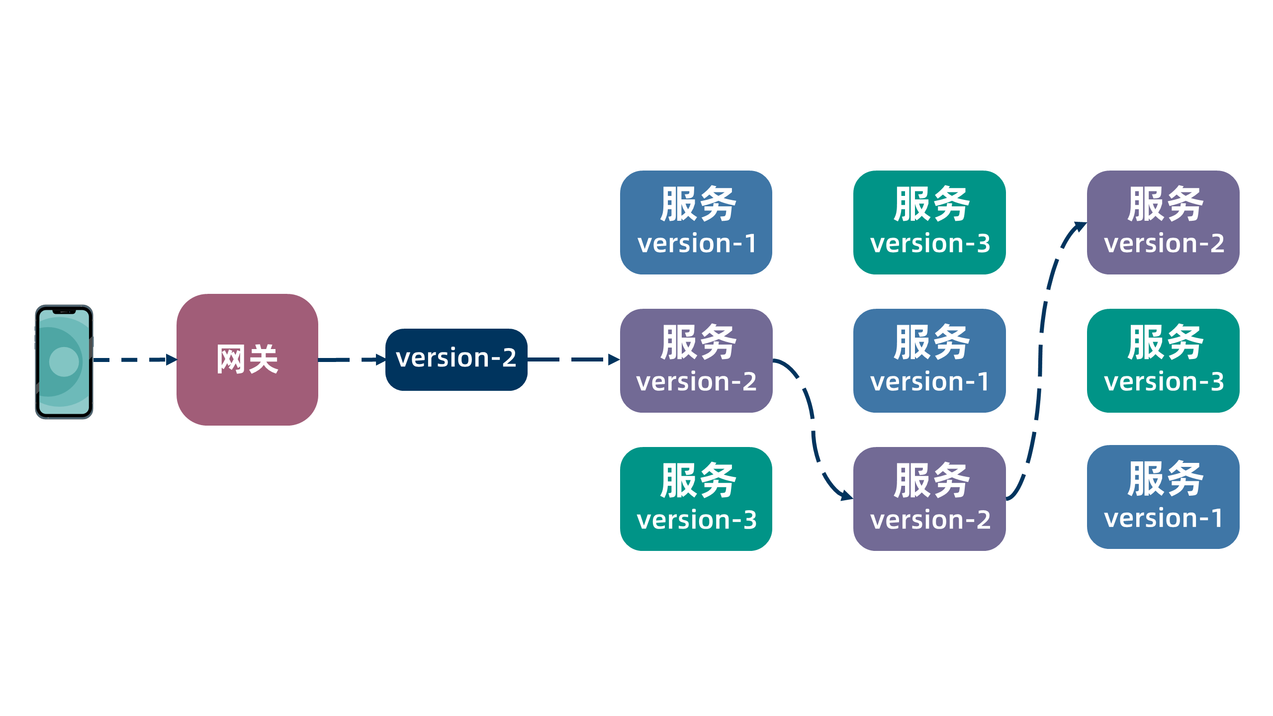 举一个例子:比如说用户调用到网关时,网关会指定一个版本,比如 version-2,接着就会让这个版本一直在请求头中传递下去,当后续调用到每一个服务时,都要判断只能版本是 version-2 的服务才可以被调用到!这样就可以保证整个链路调用的服务都是 version-2 版本的了!