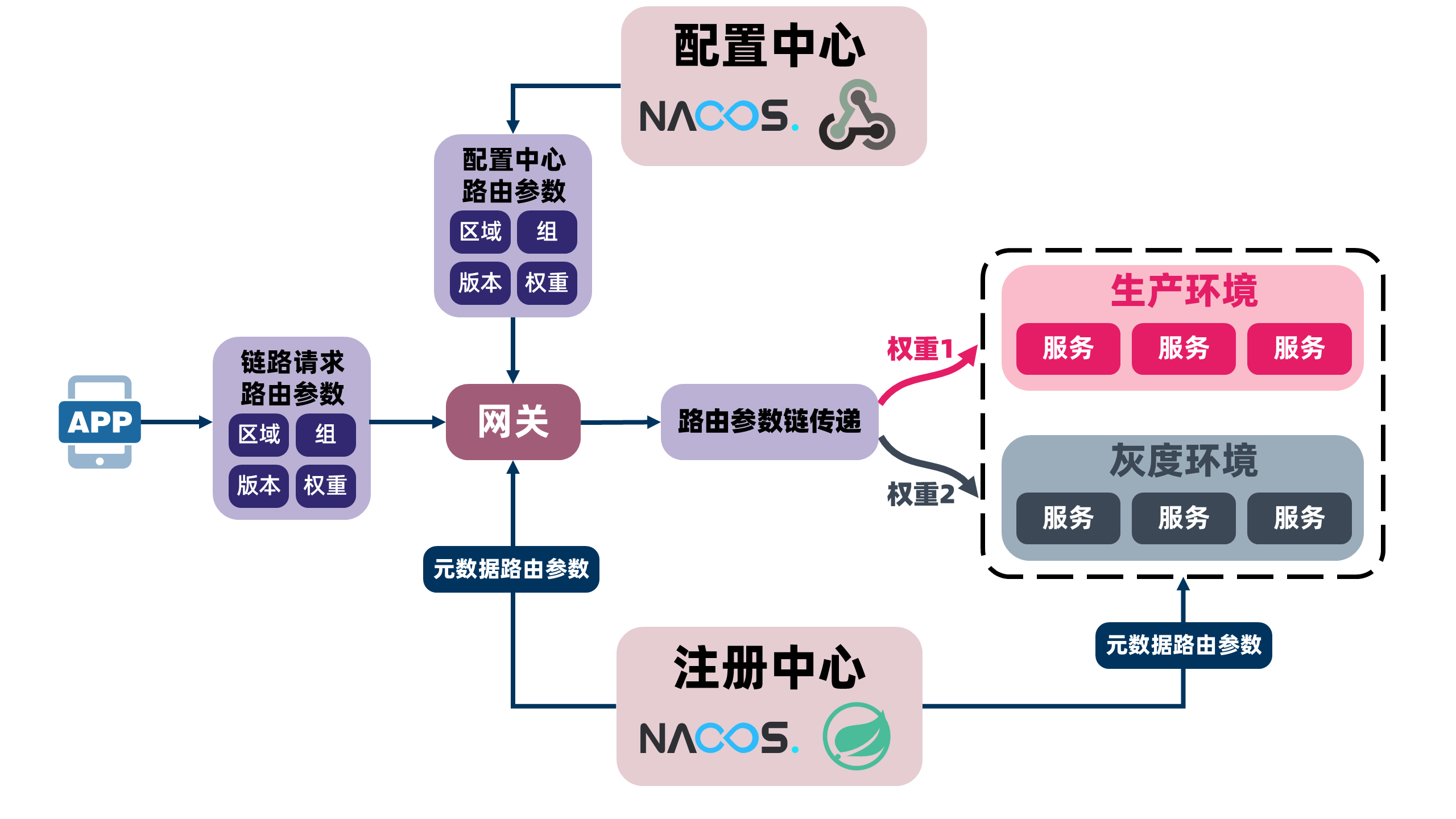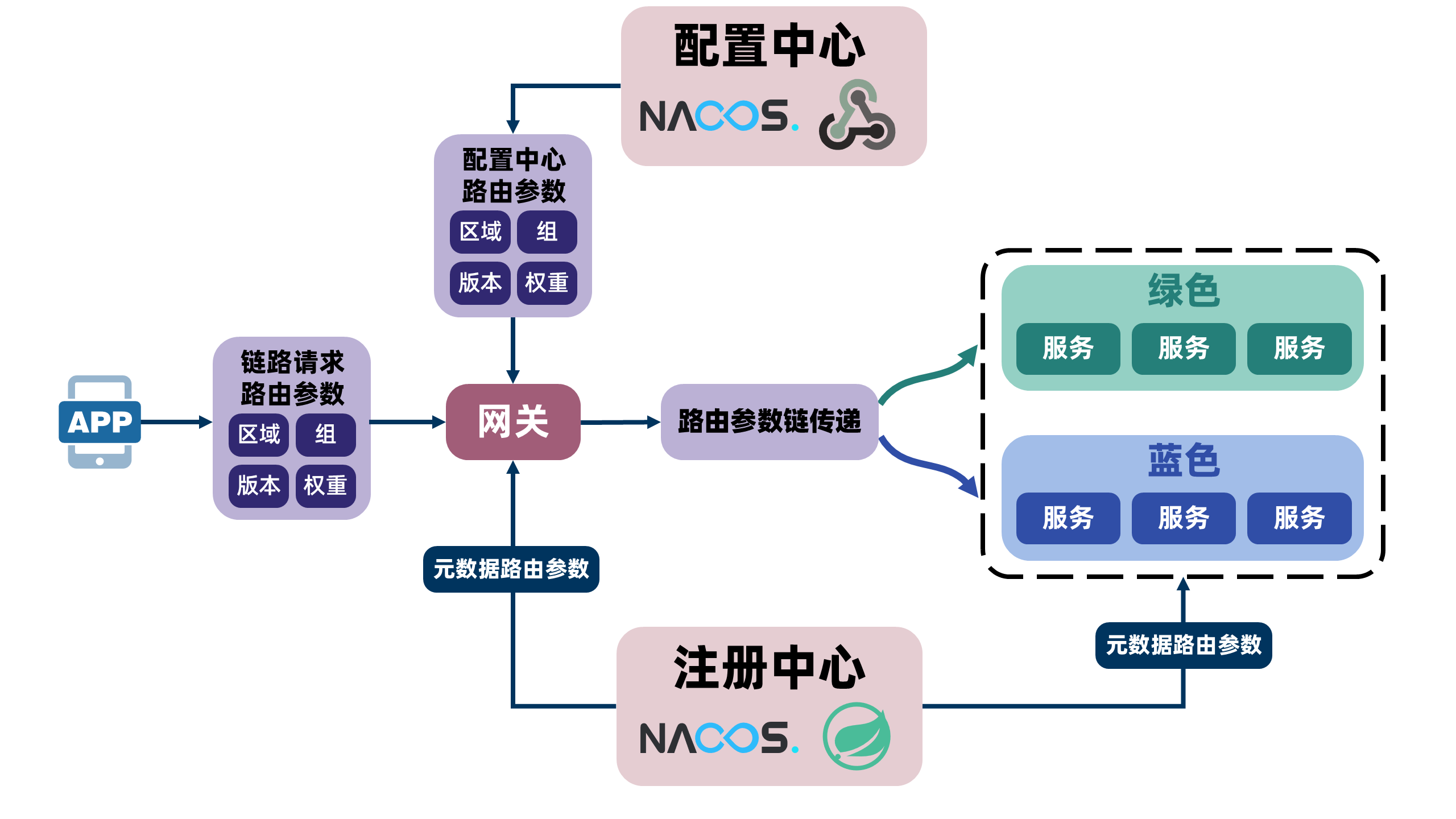 支持多维度的路由隔离过滤策略维度,包括:区域、组、版本、标识 等。还额外提供了发生服务故障时的降级兜底策略。并且这些路由的指定除了通过 请求链路 发送外,还可以通过在 配置中心 来设置(Naocs、Apollo),支持热部署,当修改参数后,会立即生效,无需重启。