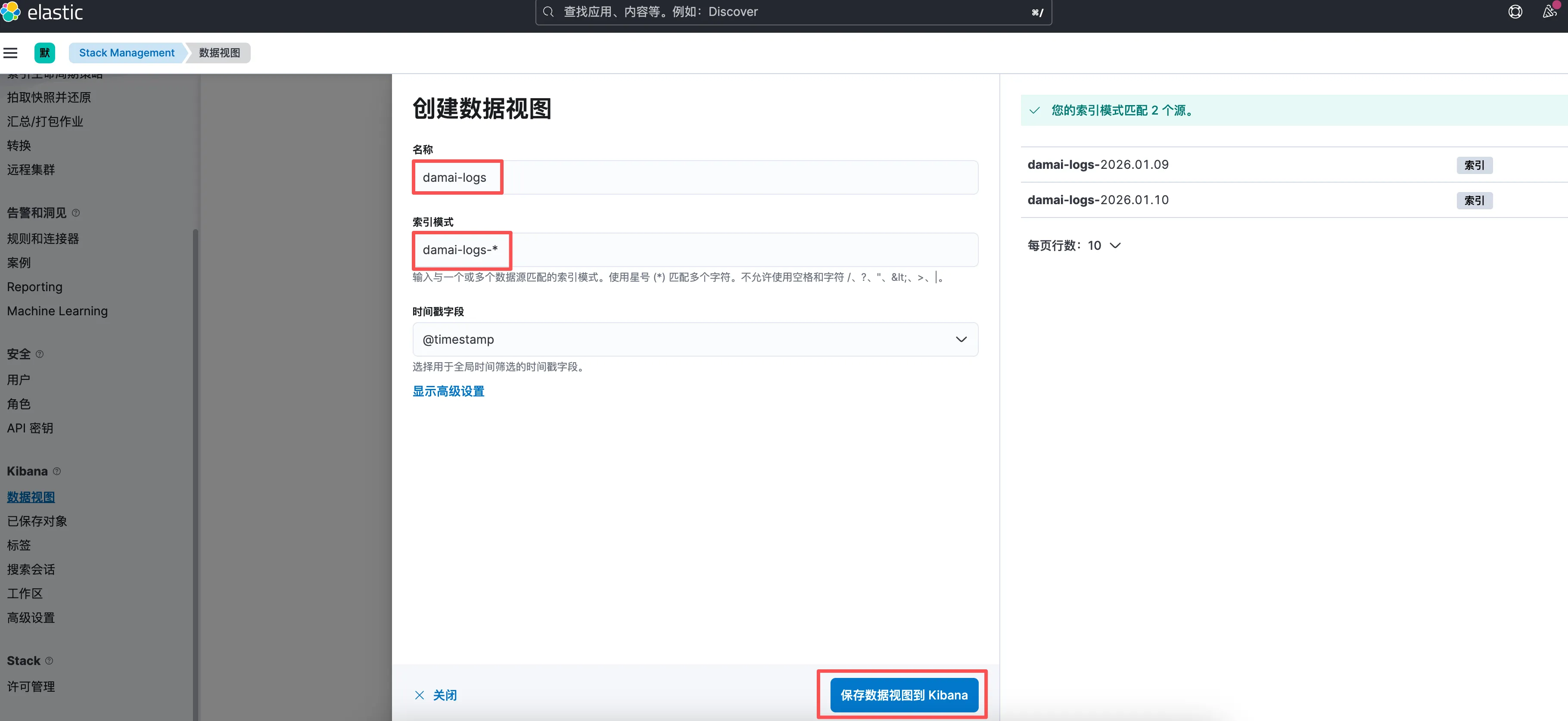 名称输入 damai-logs,索引模式输入 damai-logs-*,然后点击 保存数据视图到Kibana