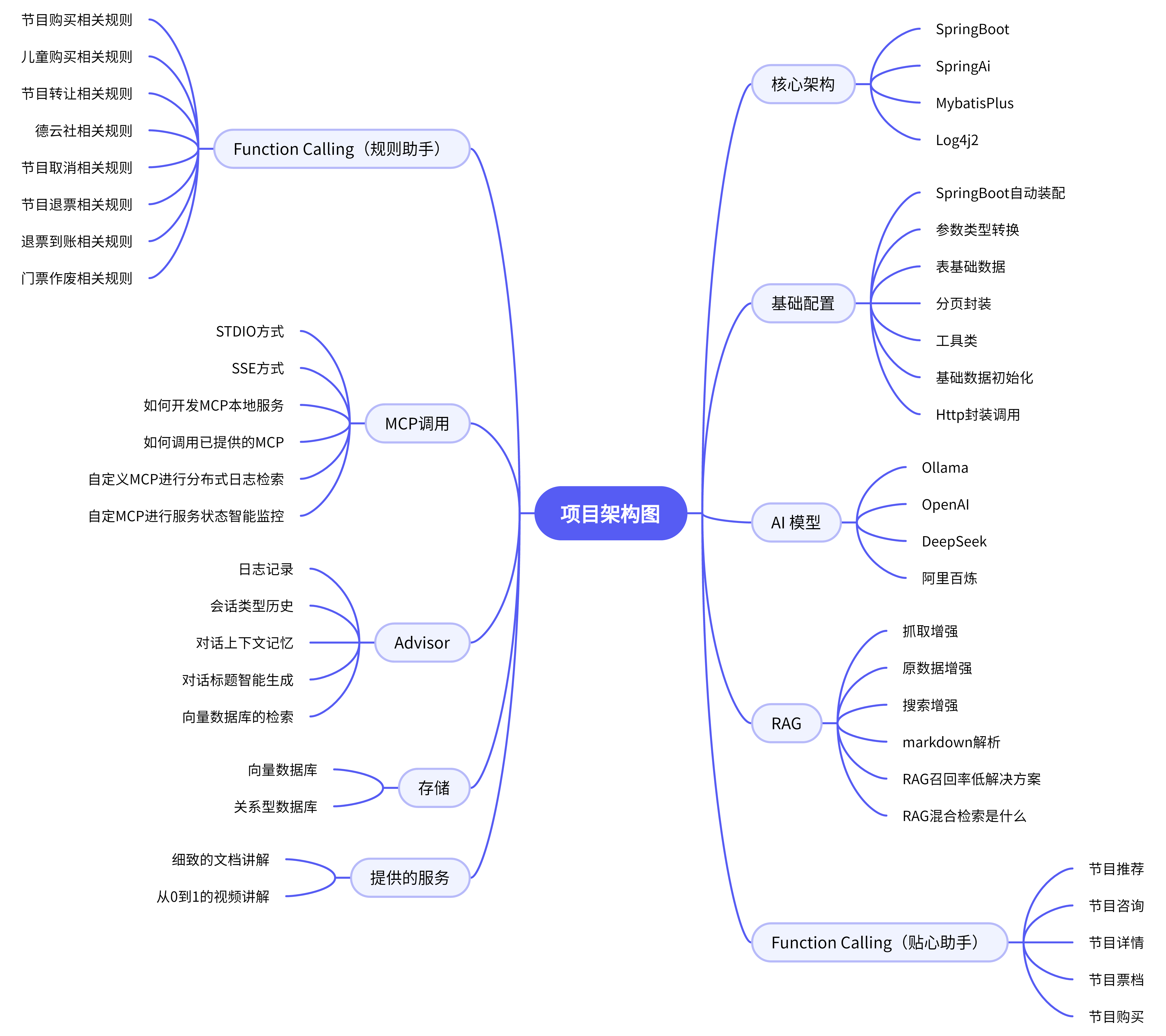 通过此业务结构图进一步详细的介绍项目中的功能,包括:核心架构、AI模型、Advisor、RAG、基础配置、贴心助手、规则助手、调用方式、存储方式等各个方面,能够对大麦AI项目的整体架构和设计有一个清晰的认知