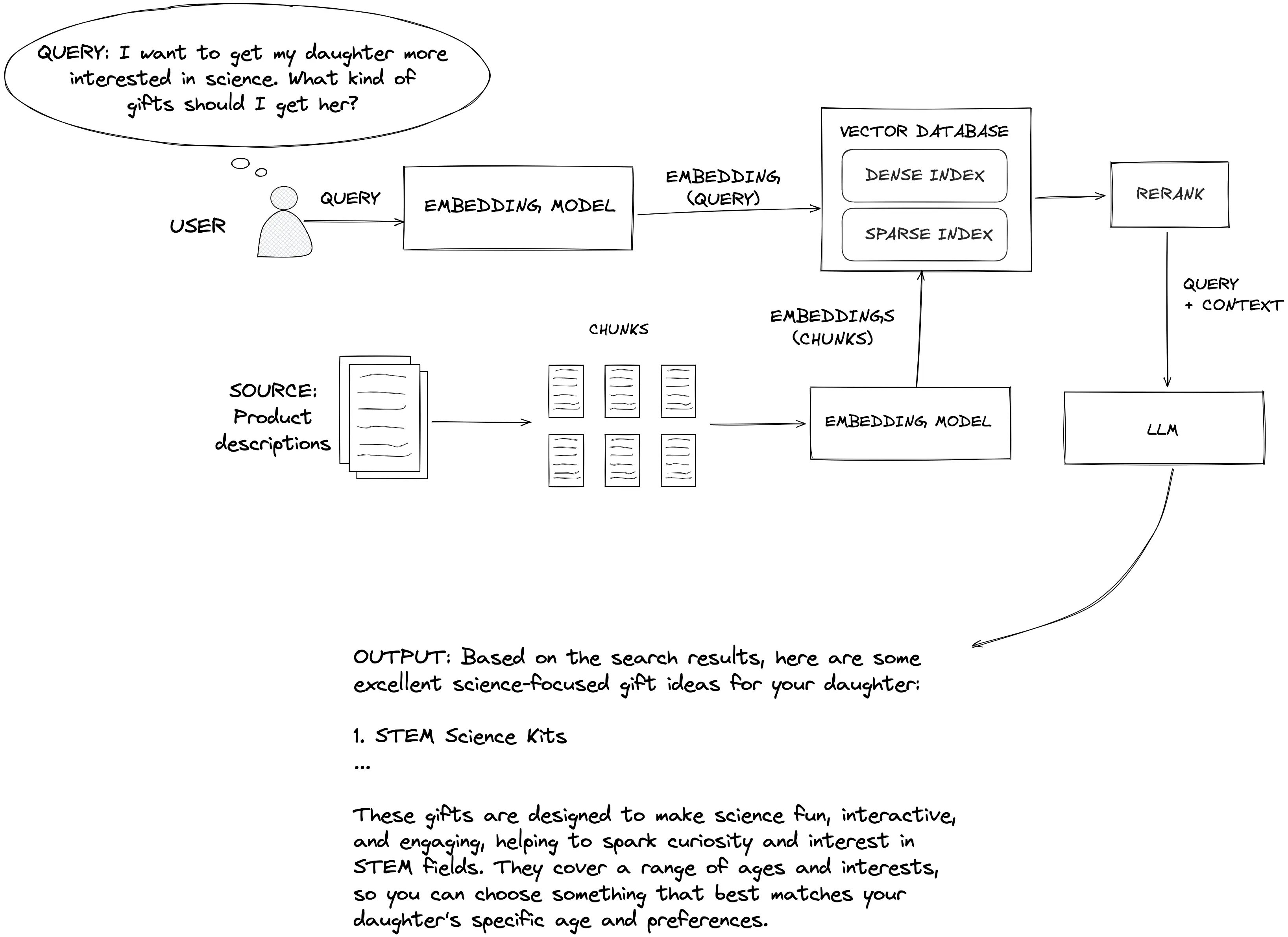 系统首先将原始文档或数据拆分并嵌入向量数据库,然后接收用户查询,将其转换为向量并检索相关文档片段,最后将检索到的信息与原始问题一同输入 LLM,生成最终回答。通过这种方式,生成模型不仅依赖自身“记忆”,还能实时参考外部知识,从而获得更准确、更可信的答案。