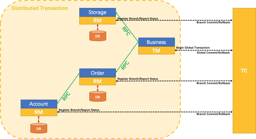 - 多服务参与同一笔业务(如“仓储”“账户”“主业务”)使用 Seata 的 AT 模式进行分布式事务。