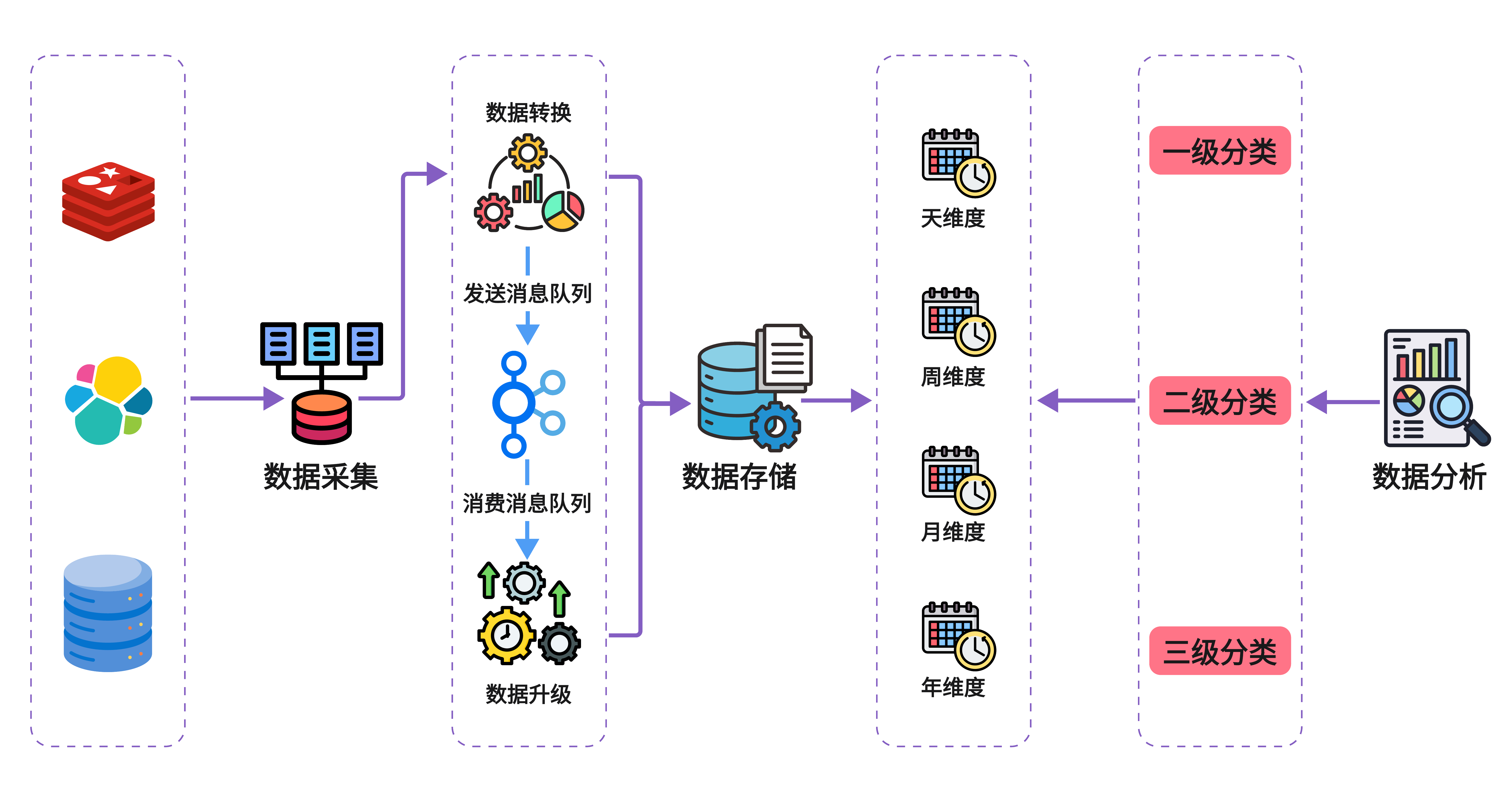 - 维度升级: 消费端进行时间窗口聚合与多级维度推进(小时→天→周→月→年)