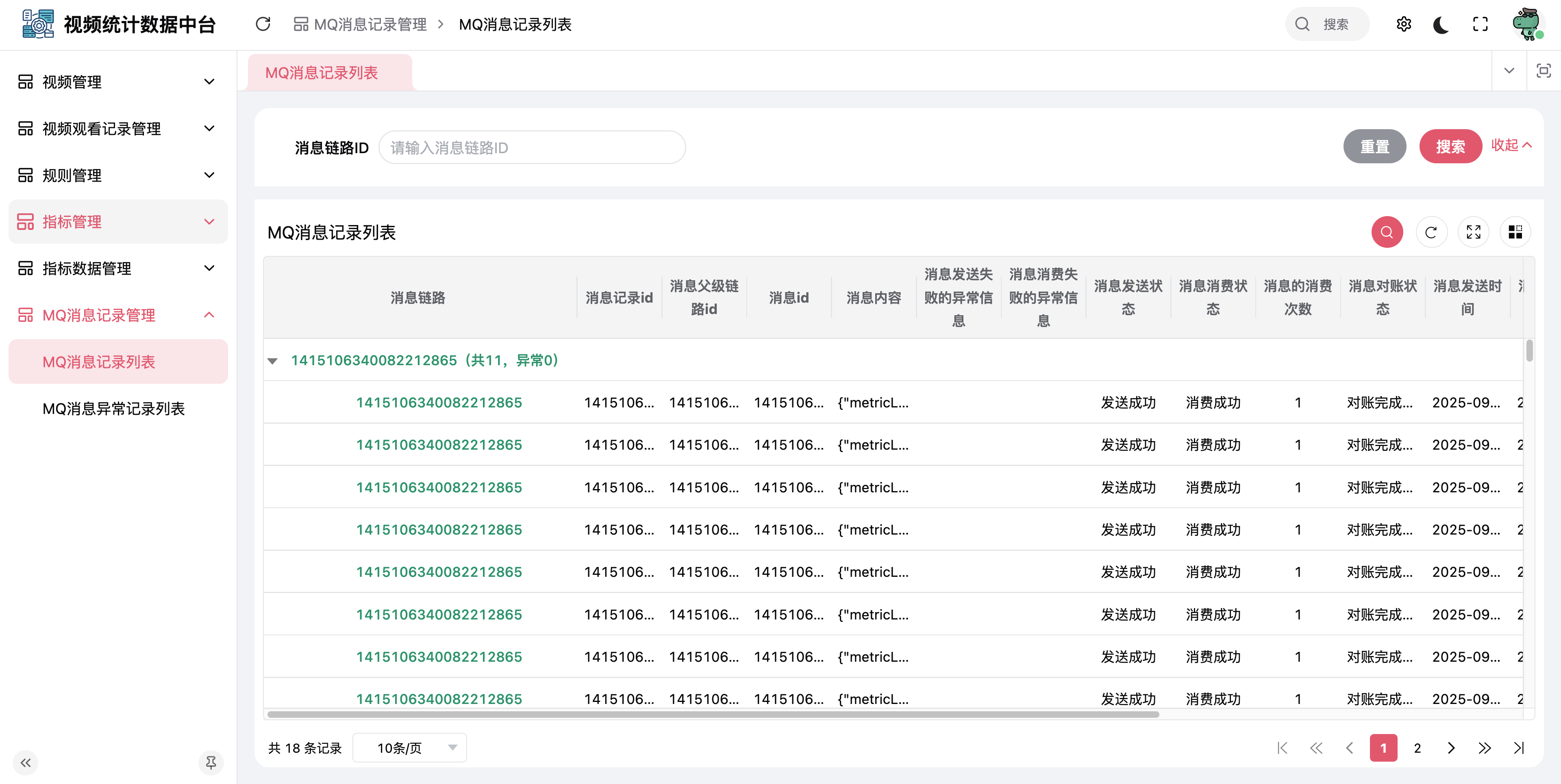 目标:面向“普通链路巡检与进度总览”,优先按 message_trace_id 聚合,展示每条链路的全量跳次与状态。